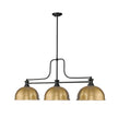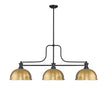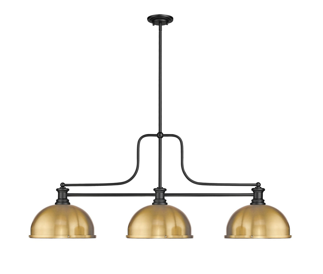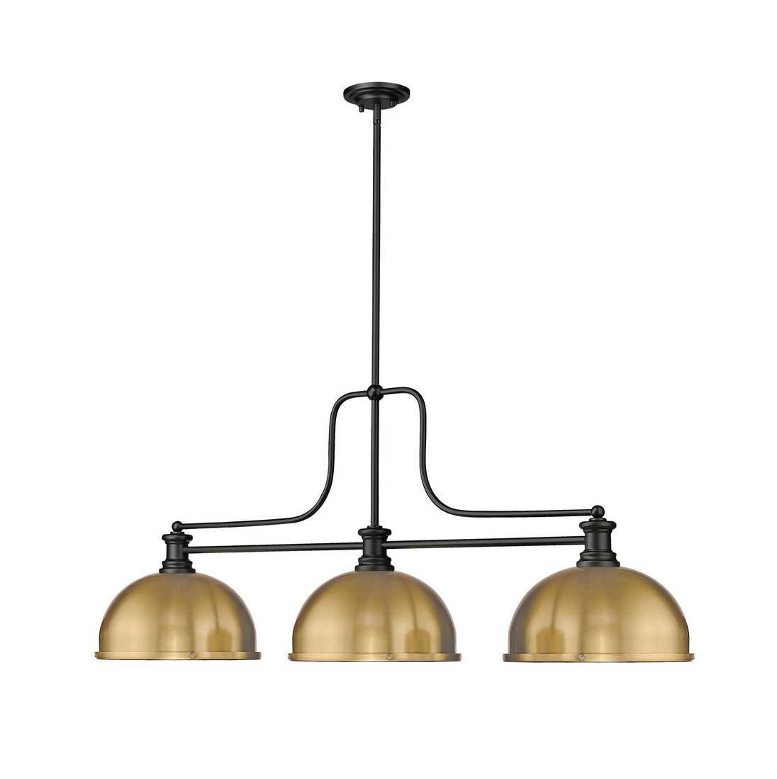 A subtle industrial vibe and warm heritage brass and matte black finish pairing flatter this three-light billiards pendant from the Mélange collection by Z-Lite. A simple yet fluid silhouette blends matte black steel and dome-shaped heritage brass steel shades forming a perfectly balanced profile. This charming fixture is an ideal solution to brighten a kitchen island or sports room billiard space.