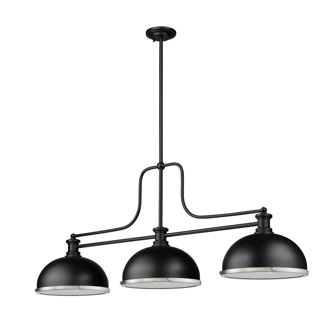 A subtle industrial vibe and matte black and brushed nickel finish pairing flatter this three-light billiards pendant from the Mélange collection by Z-Lite. A simple yet fluid silhouette blends matte black steel and matching dome-shaped steel shades complemented with brushed nickel banding, forming a perfectly balanced profile. This charming fixture is an ideal solution to brighten a kitchen island or sports room billiard space.