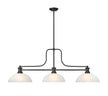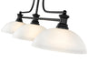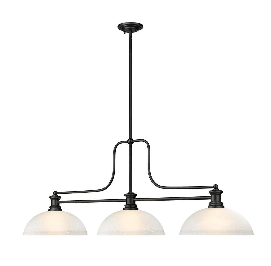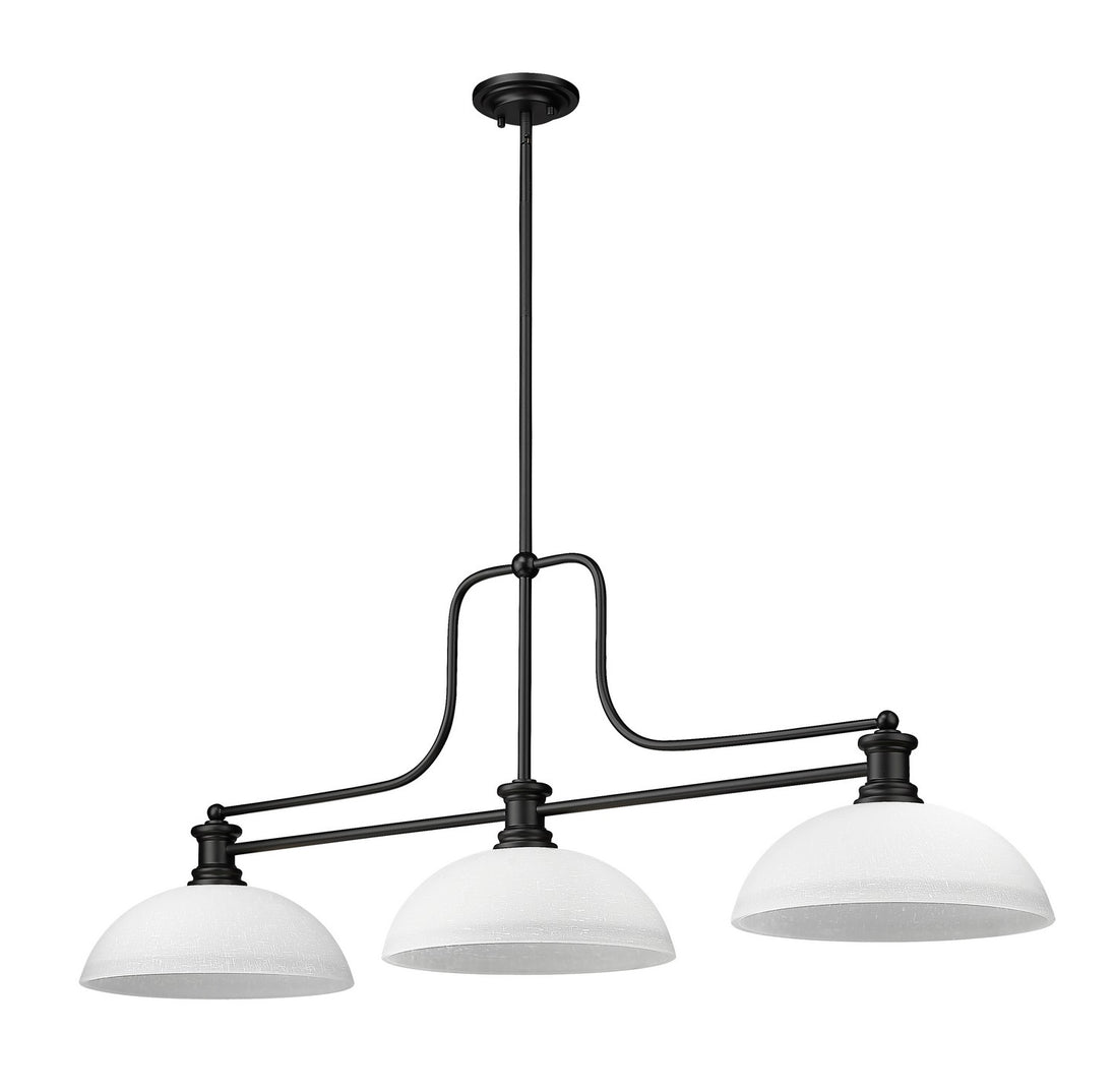 Signature details highlight the expert design and craftsmanship of a three-light linear billiards pendant. White linen glass dome shades cast a warm and welcoming glow over a kitchen island or game table, and offering a classic complement to matte black finish metal framing.