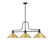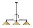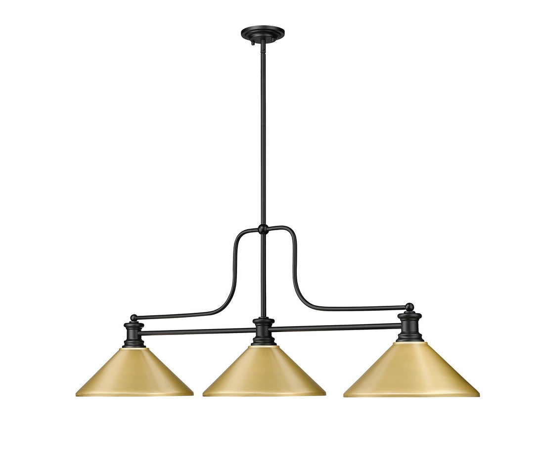 Signature details highlight the expert design and craftsmanship of a three-light linear billiards pendant from the Mélange collection. Satin gold finish steel shades add industrial flair with a conical profile, casting a warm and welcoming glow over a kitchen island or game table, and offering a classic monochromatic presentation.