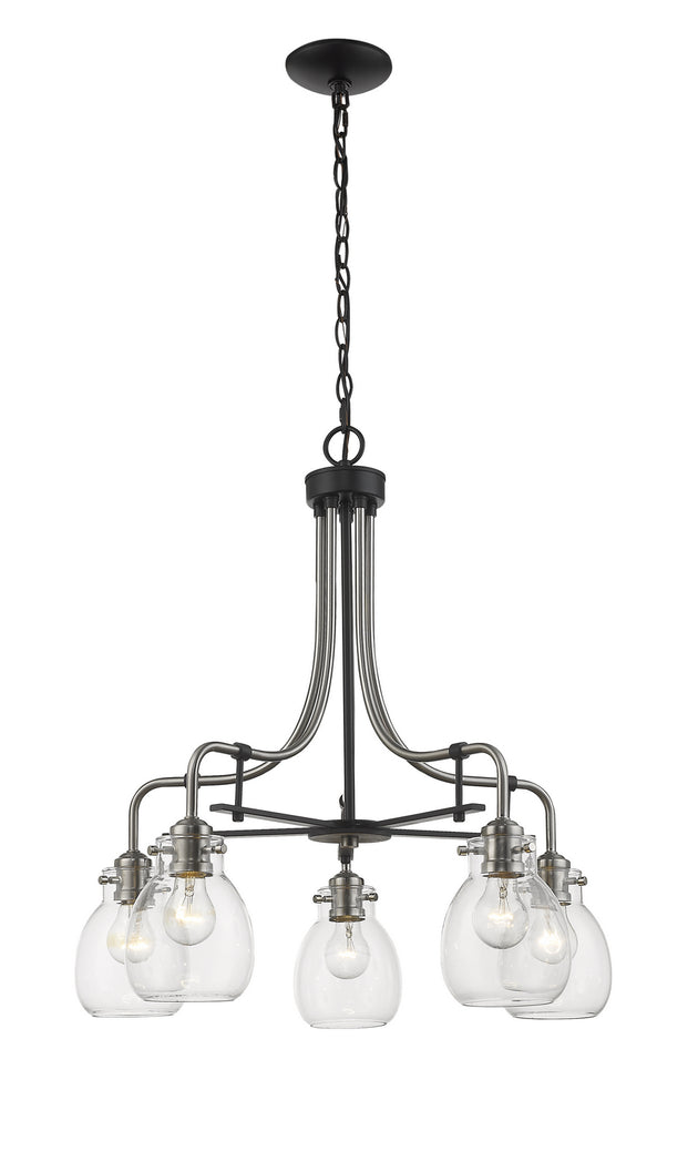 Regular price $376.00Elevate the sleek romance of a living room with the charming curves from this five-light metal chandelier. Clear glass shades beam brightly over the radiant brushed nickel finish, elevated with matte black. -