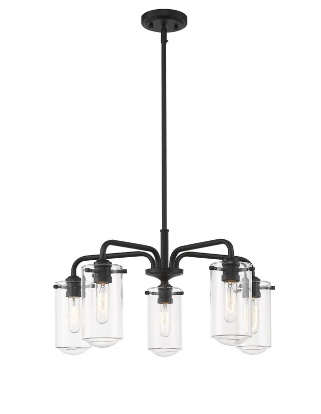 Regular price $306.00Pipe-inspired arms and a matte black finish create a rich, industrial-inspired look for this contemporary five-light chandelier. Beautiful over a dining table, the fixture shows off clear glass shades that provide abundant, true illumination for everything... -