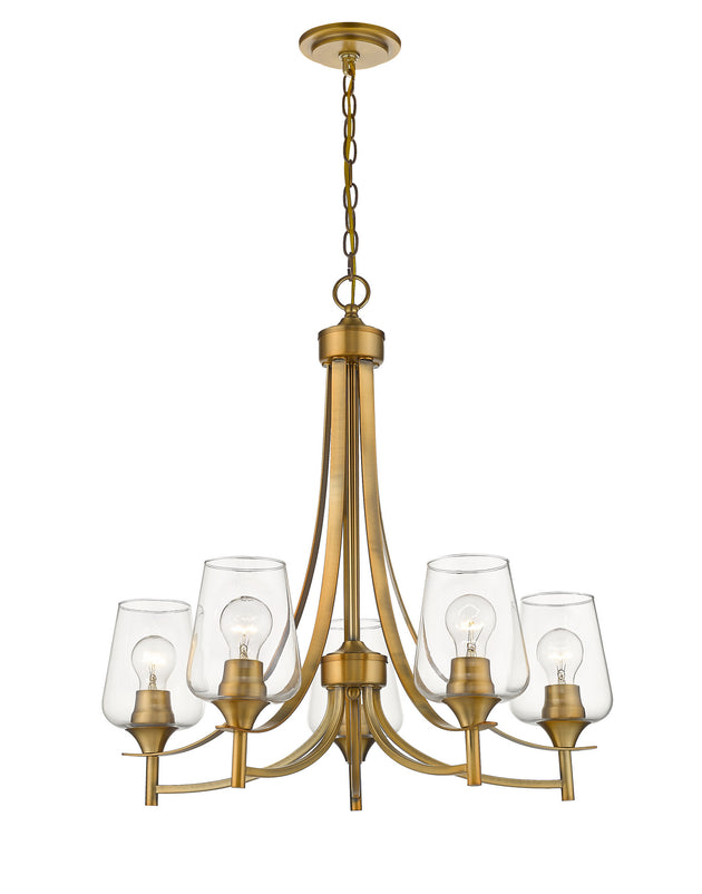 Regular price $362.00A touch of old world style gives this mid-century modern five-light chandelier elegant charm. A bronze finish emphasizes the glowing brilliance of the clear glass cylinder-shaped shades.