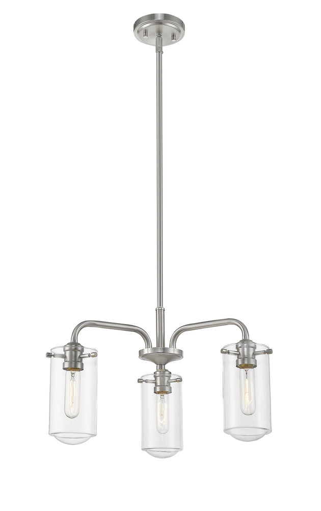 Regular price $198.00Edgy design meets softened industrial personality in a light fixture that turns heads. Make this brushed nickel and glass three-light chandelier a focal point in a custom transitional space. -