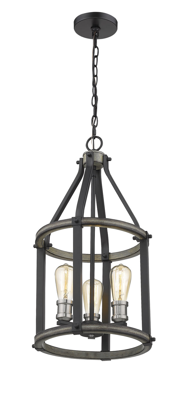 Regular price $300.00Stunning in an entryway, this three-light faux barnwood pendant looks beautiful when paired with a modern motif. The open cage-inspired silhouette highlights exposed lightbulbs in an ashen finish. -