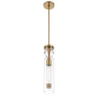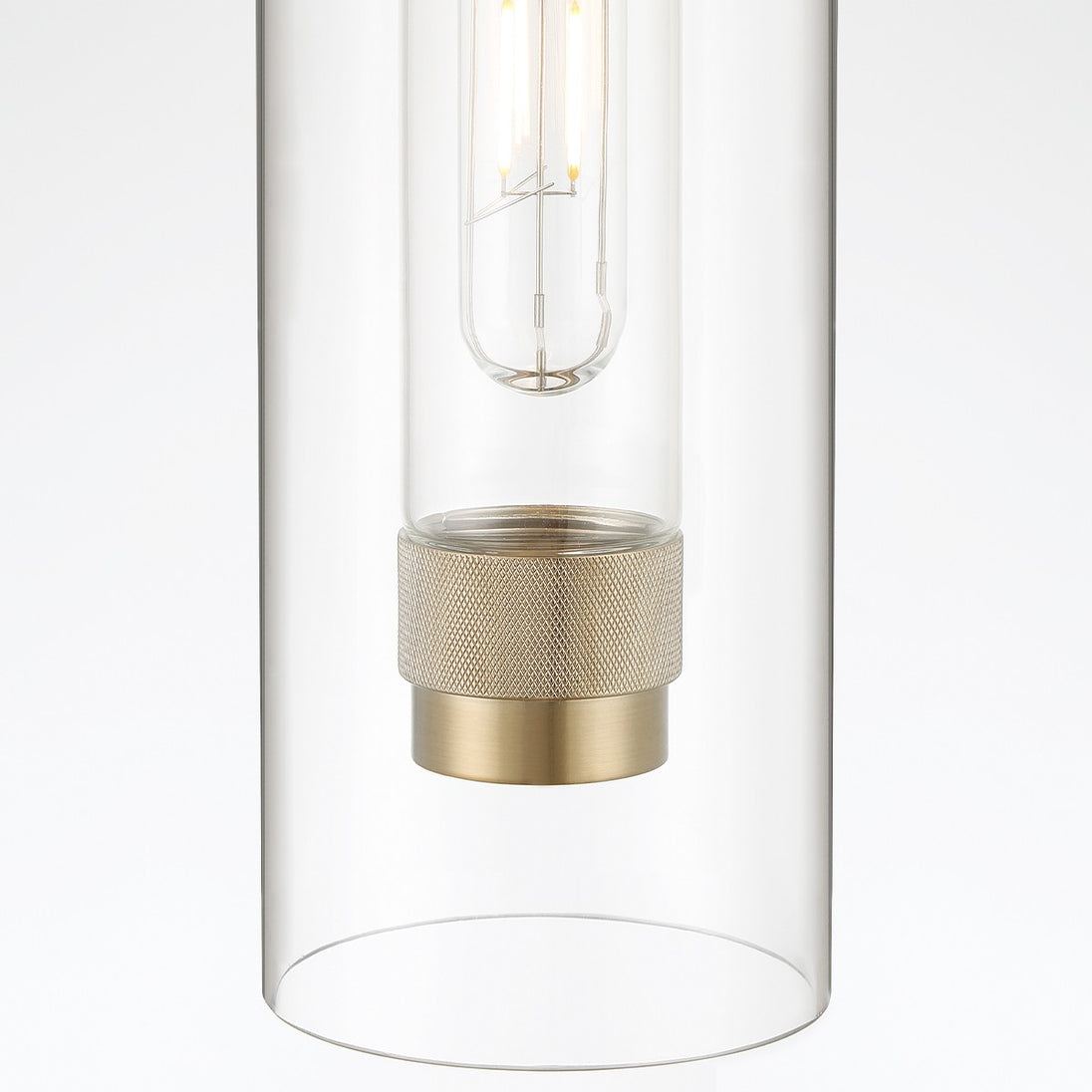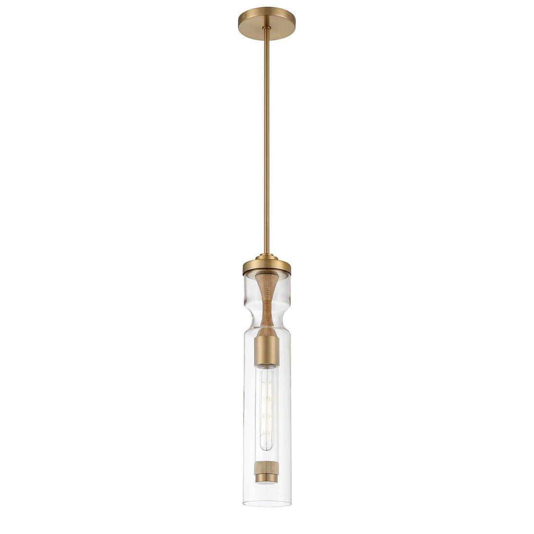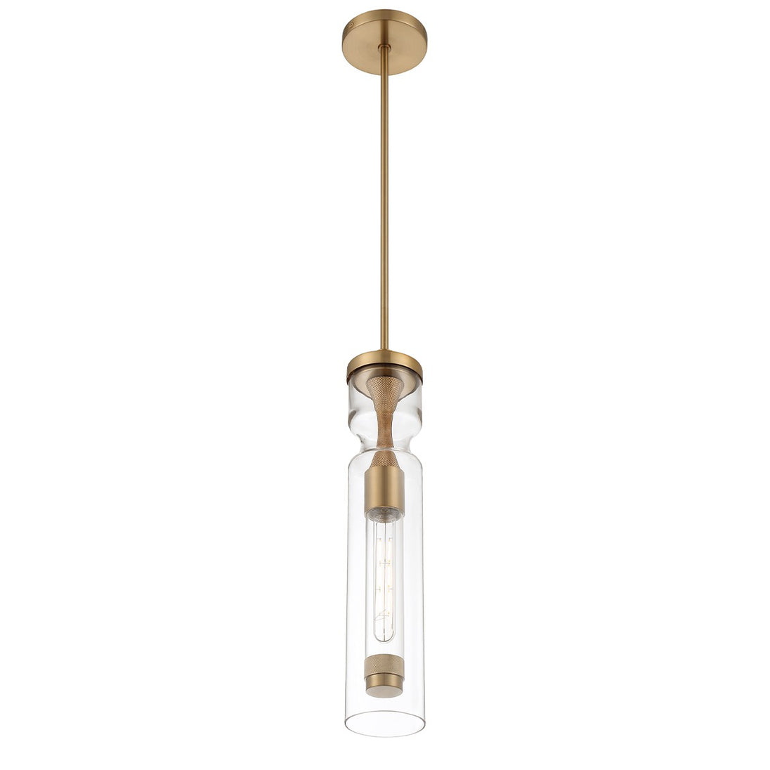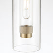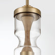 Antique electric insulators are constructed of very thick glass and pinched to accommodate wrapping. The Mistero pendant has stretched and elongated this shape into a slender silhouette of light. Machined knurling details create focal points enclosed around the thick clear blown glass shade.