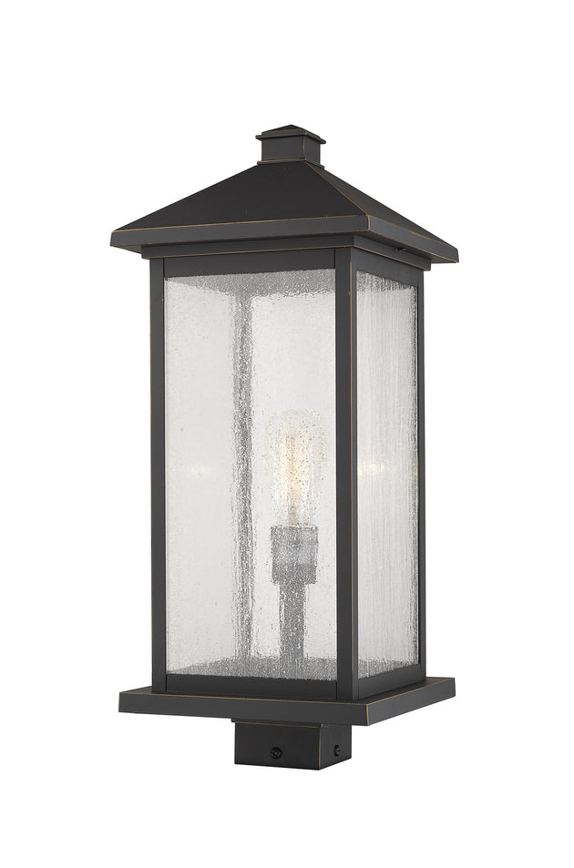 Regular price $300.00Combine rich hues with depth in this one-light post lantern. Great for an outdoor space, the sleek frame radiates with a rubbed bronze finish and a clear seeded glass shade. -
