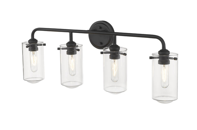 Regular price $196.00This four-light bath light offers a dynamic look that frames a master or guest bath vanity in style. Delicate clear glass shades join an industrial themed frame and mount with a cool matte black finish. -