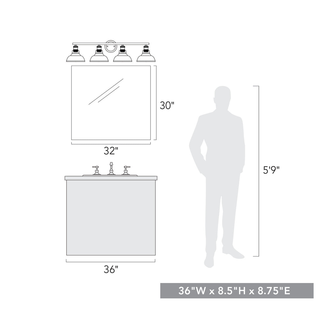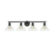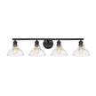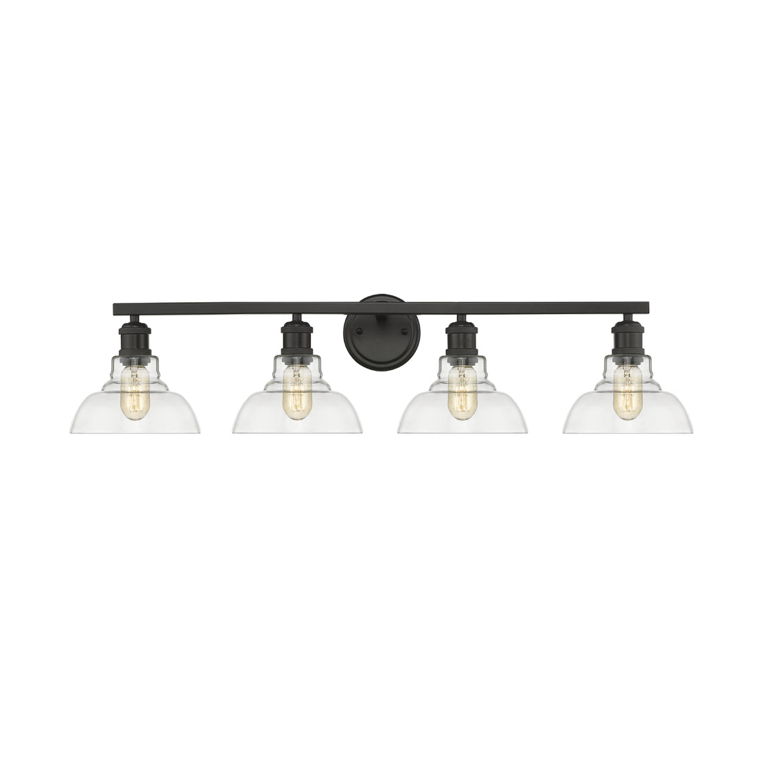 Bring sophisticated style into your home with the Yep by Golden Lighting Carver 4-light Vanity. Featuring a glass shade and a Matte Black frame, it creates a modern ambiance perfect for any space. The clear glass shade offers brilliant, unobstructed light, allowing the beauty of the bulbs to shine through. The Matte Black finish is a hallmark of clean, modern design, exuding an understated elegance that complements a wide range of decors, from minimalist to bold contemporary styles. Ideal for bathroom lighting, this fixture is Damp Location Rated, suitable for areas with occasional moisture. It requires 4 E26 Medium base bulbs (not included), with a maximum wattage of 60 per bulb. Dimensions: Overall Dimensions: 36"W x 8.63"H x 8.63"D. Transform your bathroom with a high-quality fixture designed for both function and style.
