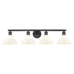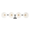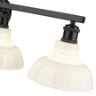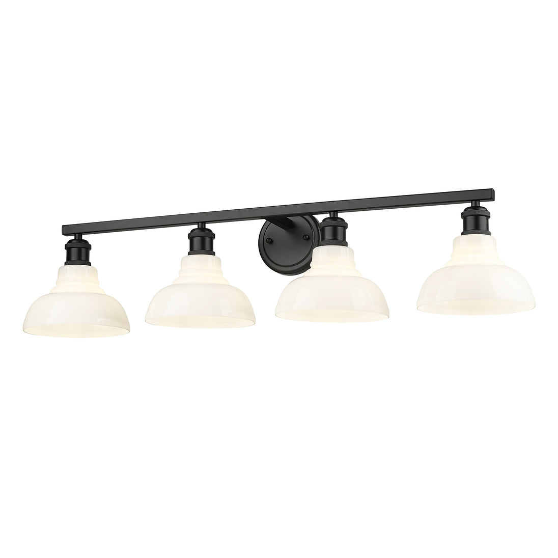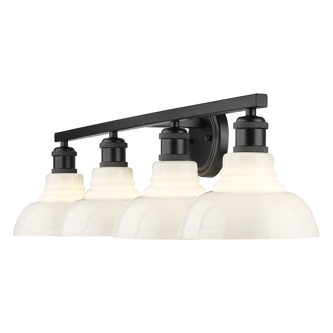 Bring modern elegance into your home with the Yep by Golden Lighting Carver 4-light Vanity. Featuring a vintage milk glass shade and a matte black frame, it creates a welcoming atmosphere. The vintage milk glass shade features a dense, opaque milky white color, polished to a beautiful, glossy sheen. This classic glass provides a soft, luminous glow, reminiscent of schoolhouse antiques, perfect for a charming touch to your space. The matte black finish is timeless, versatile, and smooth to the touch, offering an understated elegance that complements various decor styles. Ideal for bathrooms, this fixture is damp location rated, making it suitable for covered areas with occasional moisture. Requires no specific installation and is flexible enough for most spaces. Overall Dimensions: 36"W x 8.63"H x 8.63"D. Requires 4 E26 Medium base bulbs (not included), up to 60 watts each. Enhance your lifestyle with this quality fixture that merges style with functionality.