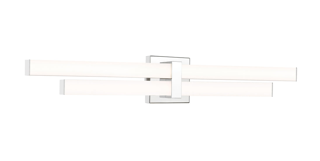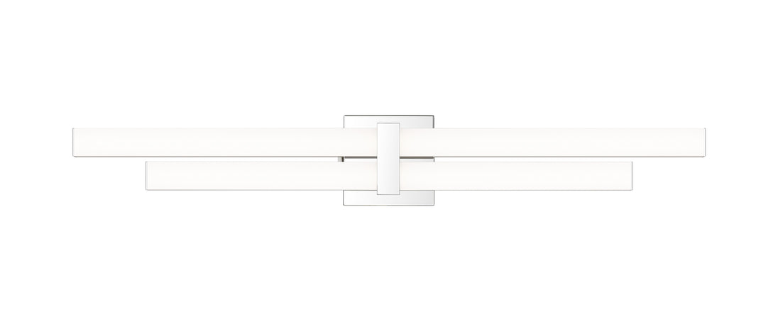 Optically captivating structural silhouetting shows off contemporary vibes in a modern two-light vanity light perfect for custom bath spaces. Aluminum framing and accents offer a cool chrome finish, as graduated frosted bar diffusers align vertically to emit dimmable LED lighting with a customized option of white color values.