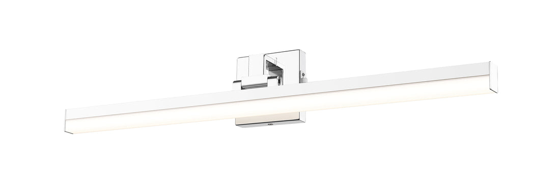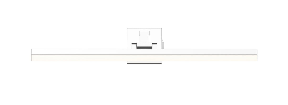A geometric linear design adds a mix of modern and transitional industrial attitude in this one-light vanity light. Sculptural elements maintain symmetry and clean lines in a fixture with a bright chrome finish aluminum frame and a frosted plastic diffuser, emitting dimmable lighting with options for perfecting the level of ideal white color.