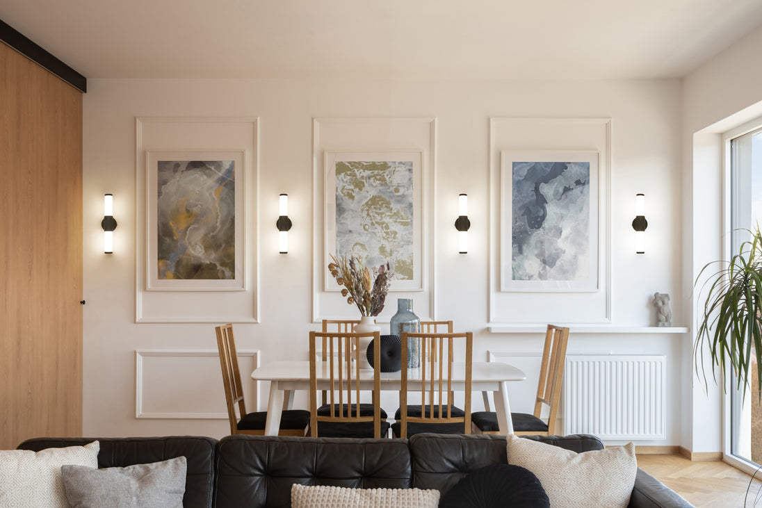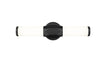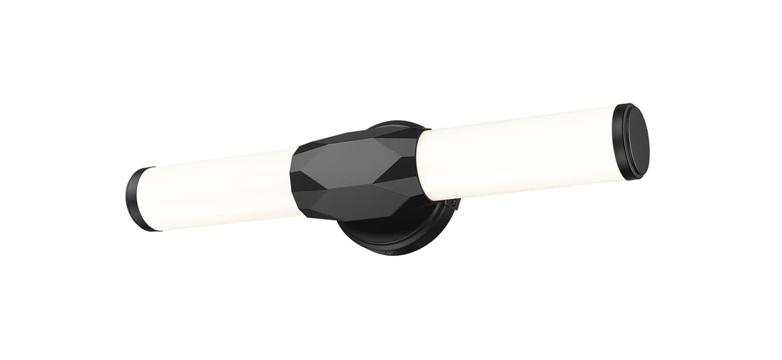 Contrasting colors stand out in the design of a one-light vanity light with a hint of Art Deco style. Aluminum framing with a bold matte black finish includes end caps and a prism-inspired holder, embellishing the rich geometric and complete package of a light fixture with optional color temperature values.