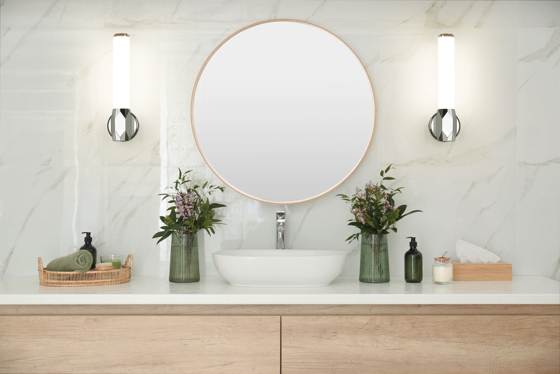 An ode to Minimalism, the Cooper 18-inch dimmable LED vanity light boasts a streamlined profile that complements every style of powder room or master bath. A choice of 5CCT allows users to select an ideal color temperature with 90 CRI. The central medallion and end caps add traditional flair. It is available in Matte Black, Brushed Nickel, Chrome, and Modern Gold.