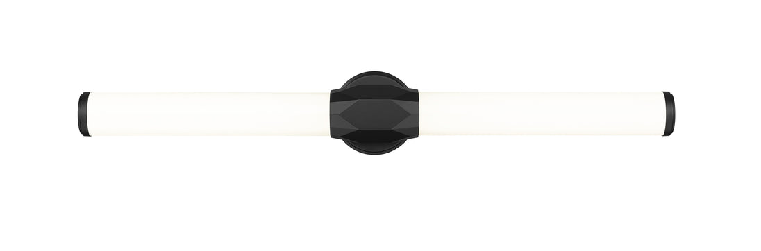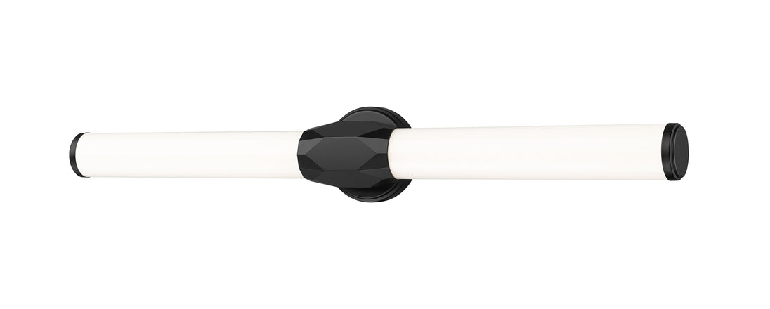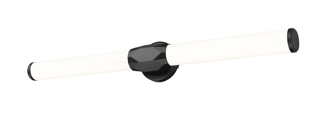 A dramatic finish and cool Art Deco inspiration repurposes industrial-modern styling in this one-light vanity light. Aluminum framing with a bold matte black finish includes end caps and a prism-inspired holder, furthering the rich geometric and complete package of a light fixture with optional color temperature values.