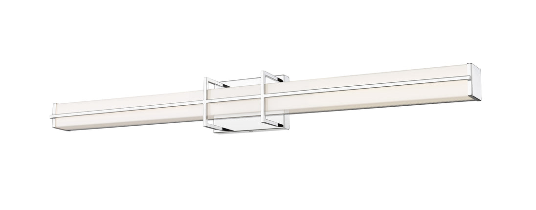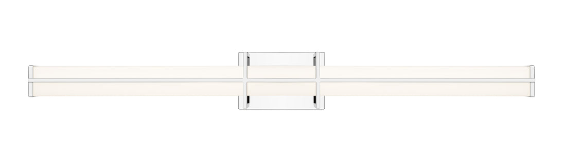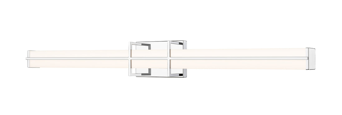 A charming bracket pairs vertical and horizontal elements to create a chic presentation for a modern linear vanity light. Its energy efficient LEDs are dimmable, with selectable color temperature for just the right ambiance. A cool chrome finish completes the framework of this fixture, while a frosted diffuser ensures soft, bright ambient illumination that's ideal for daily grooming and beauty tasks.