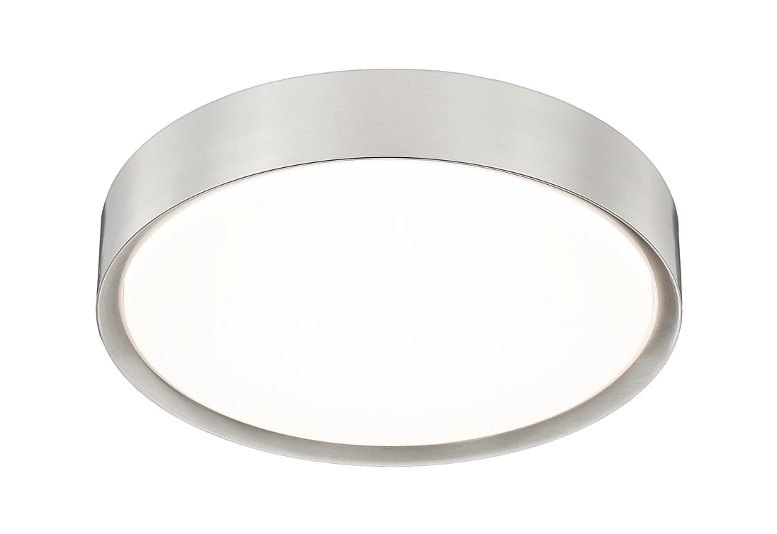 Sleek brushed nickel creates a fresh, refined look for this modern one-light flush mount ceiling light. Integrated LEDs are energy efficient, delivering diffused lighting through a frosted acrylic diffuser that complements a streamlined round silhouette to perfection.