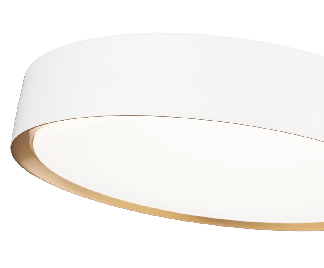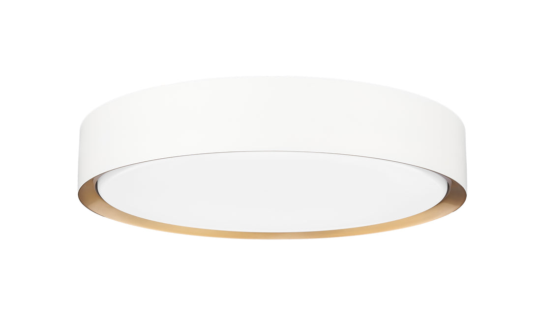 Matte white pairs with modern gold to create an alluring presentation for this modern one-light flush mount ceiling light. The white exterior and warm gold interior create a soft, graceful style, while delivering an inviting presentation. A frosted acrylic diffuser softens illumination from integrated LEDs, offering seamless style and energy efficiency.