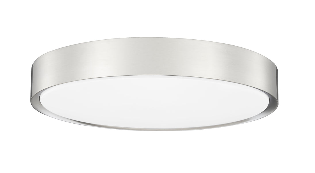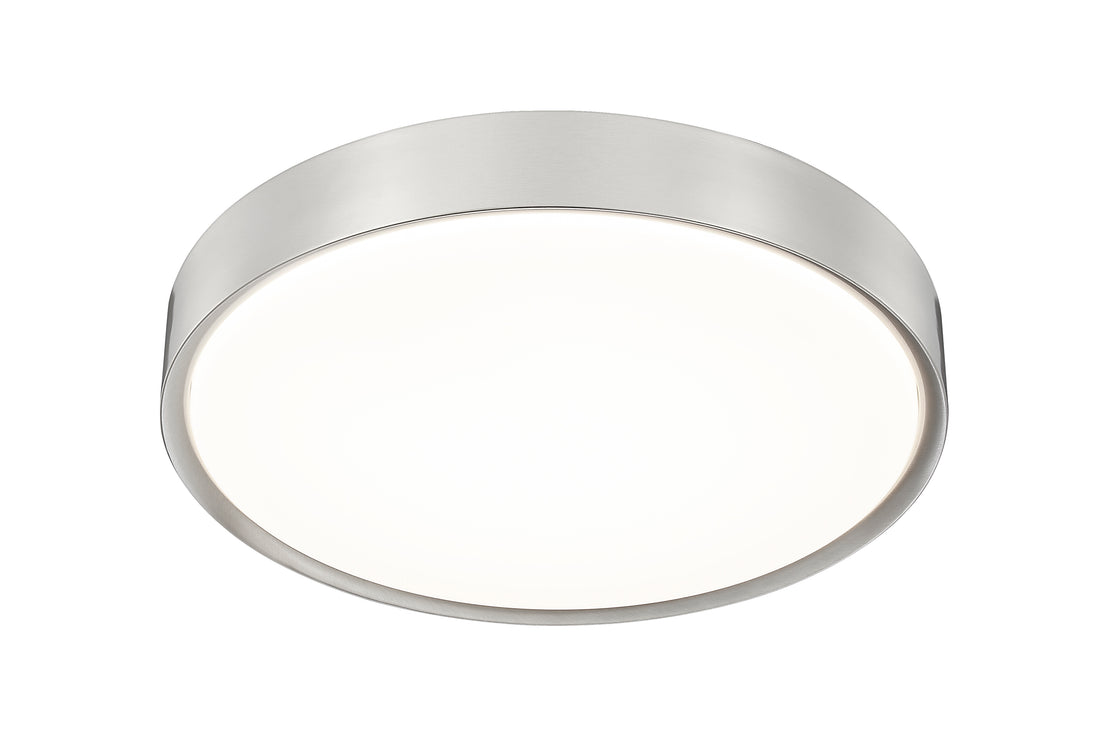 Take decor to new heights with the fresh look and feel of a modern one-light flush mount ceiling light. Its generous size is complemented with a sleek brushed nickel finish, offering the perfect complement to a rounded frosted acrylic diffuser, delivering beautiful illumination in a living area, den, or bedroom.