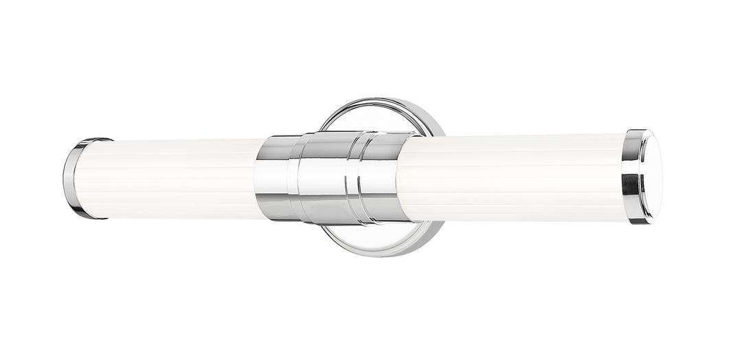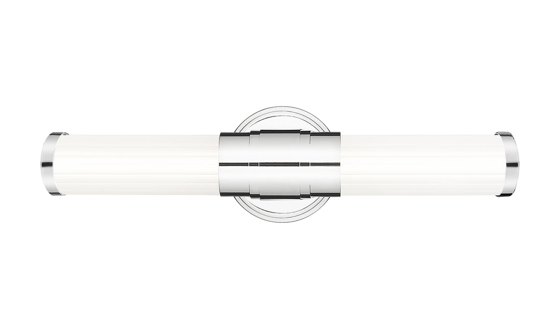Delicate ribbed glass adds texture and depth to a modern LED vanity bath light. It's a clean, precise look with a chrome finish over its steel frame, with a stepped collar that conceals its integrated LED light. The energy efficient fixture is dimmable and color selectable for the perfect look in any bath.