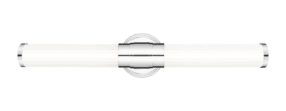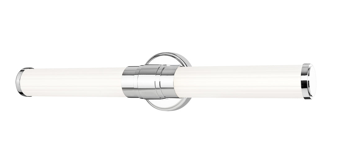 A stepped collar and delicate ribbed glass create a chic look and feel for this modern LED vanity bath light. In a chrome finish, it gleams brightly, offering diffused illumination with cylindrical opal glass that casts inviting illumination. Its integrated LED is dimmable and color selectable for custom ambiance.