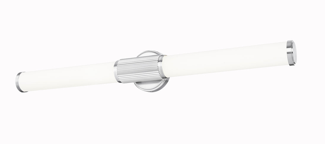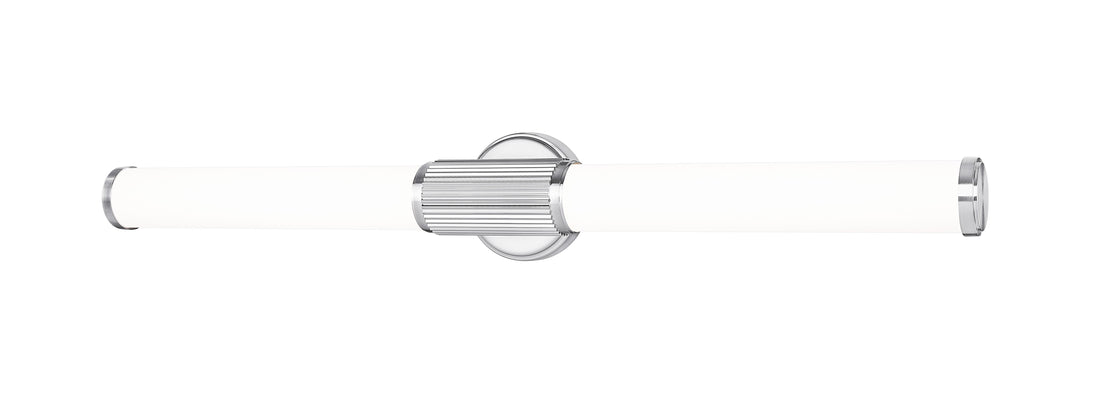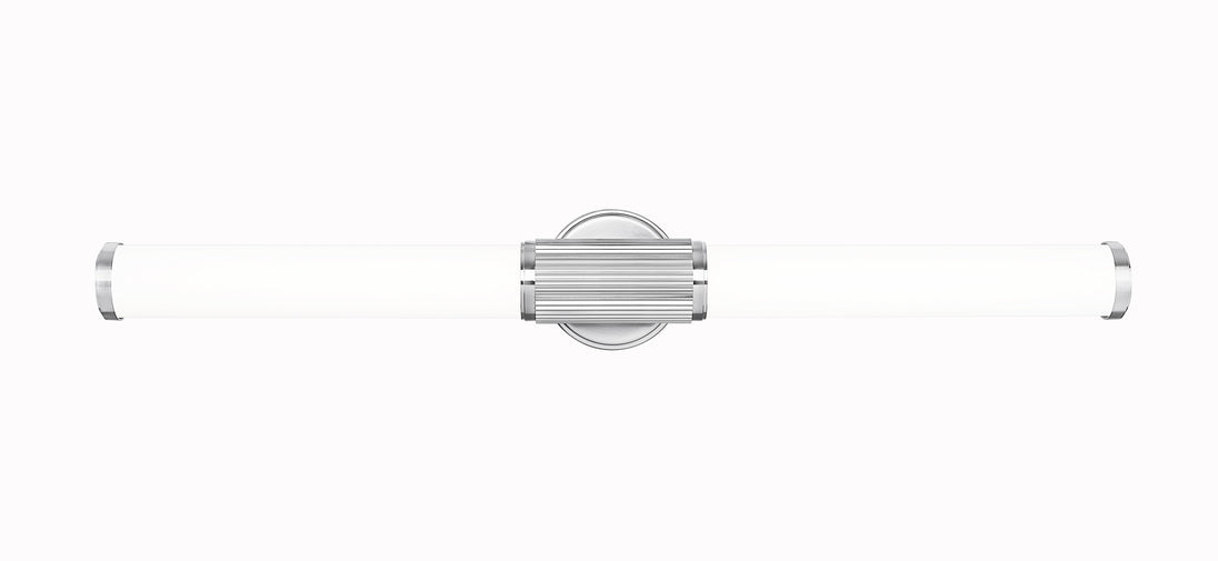 Step up to sophistication with this modern LED vanity bath light. Beautiful in an en suite, it boasts a generous length with cylindrical opal glass diffusers for inviting illumination. Its steel frame includes a smooth beveled wall plate and fluted cuff, all in an elegant brushed nickel finish that gleams in the light.