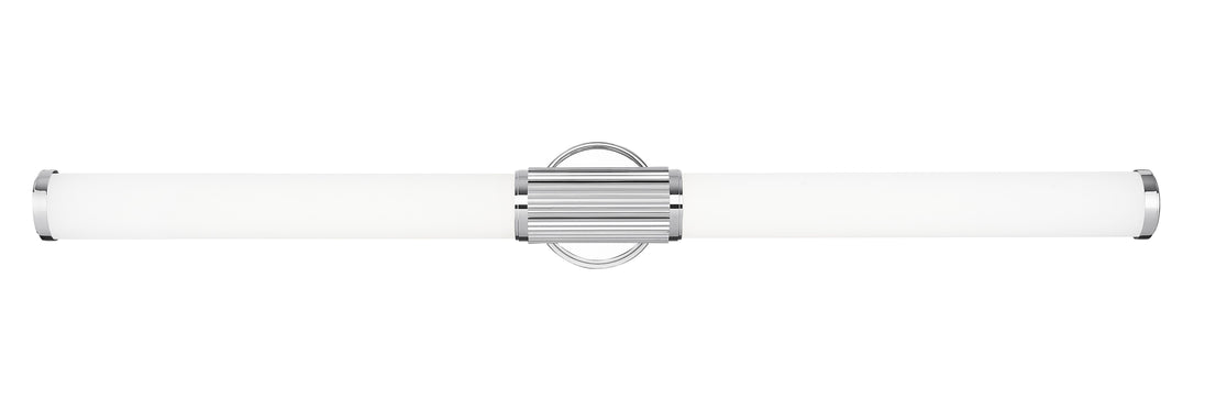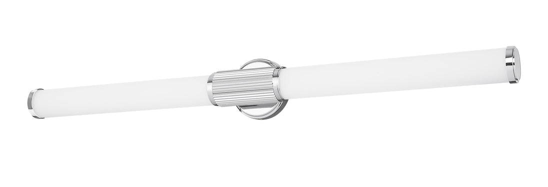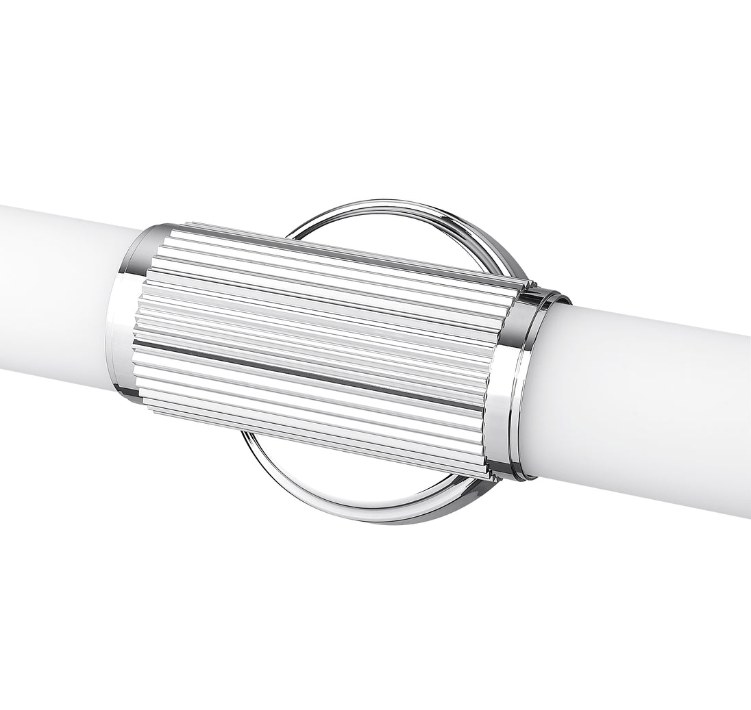 Chic chrome sets the tone for this modern LED vanity bath light. Delivering generous size and bright light, the fixture includes a pair of cylindrical opal glass shades, ensuring inviting illumination. The fixture is defined with its fluted cuff and beveled wall plate, creating a smooth, sleek appearance that's sure to elevate your en suite.