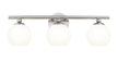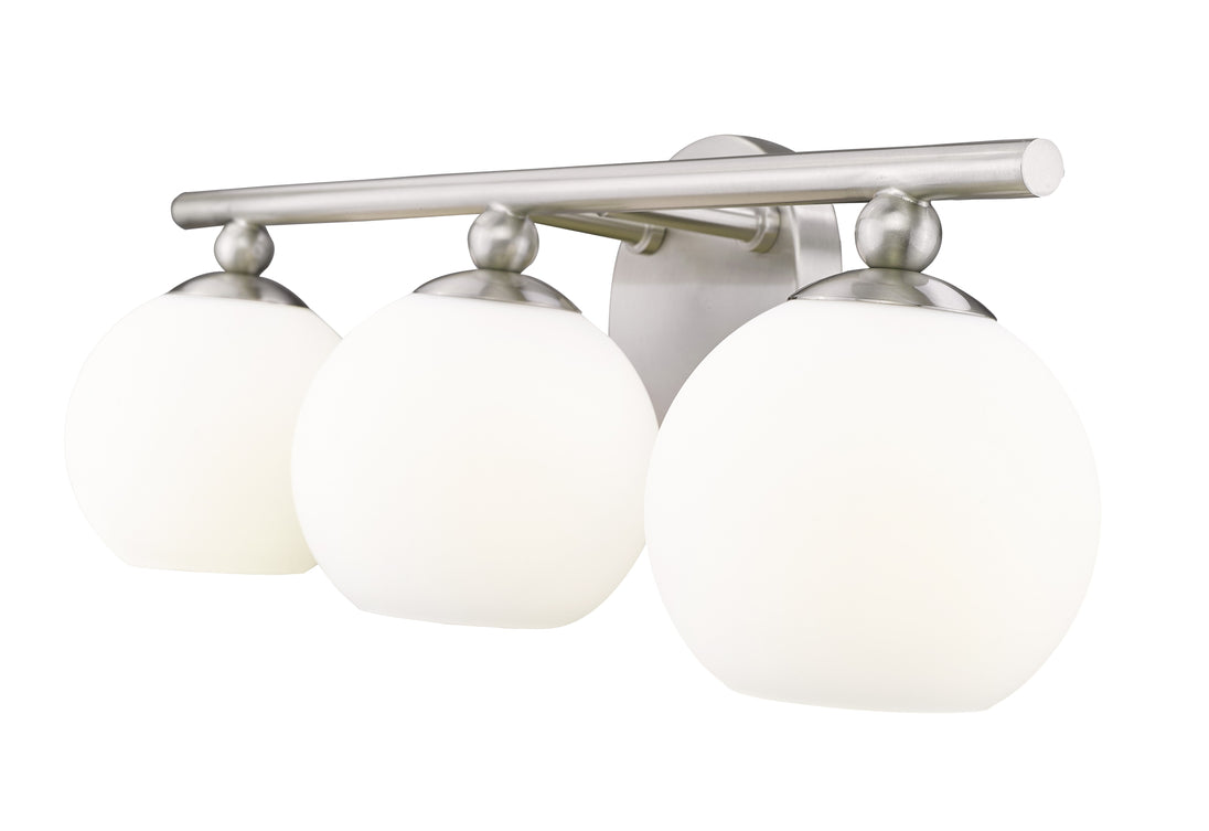 Highlight a custom vanity with this contemporary three-light vanity wall light, a classic mix of modern and retro elements that bring festive attitude. From the Neoma collection comes a vanity light ideal for an updated ensuite or guest bath with a craving for attention. Opal etched glass globe shades and a minimalist-inspired brushed nickel finish steel frame join to deliver a stylish look with charming personality.