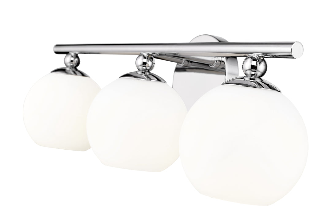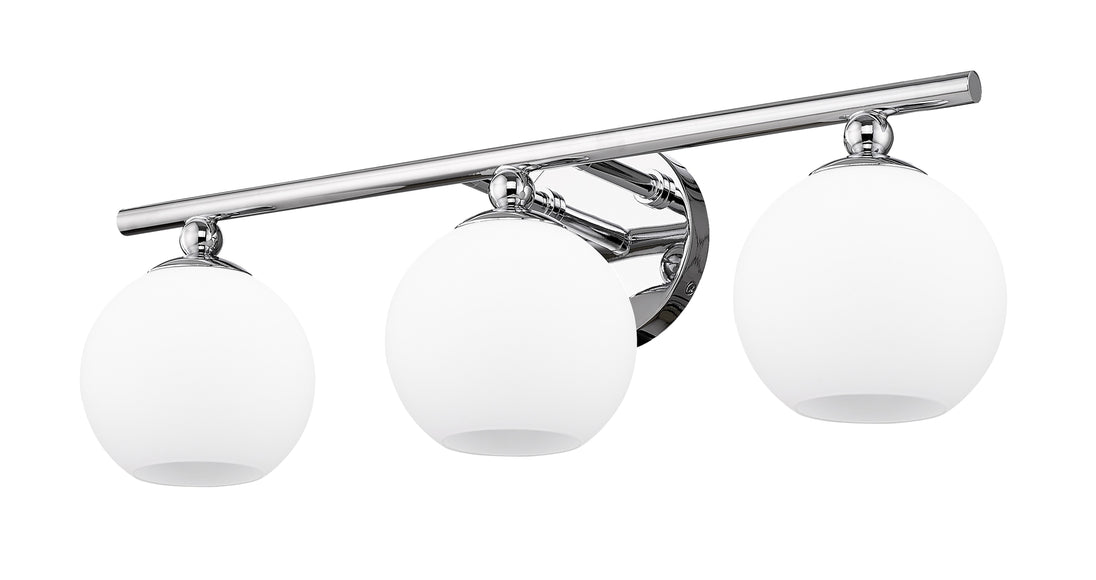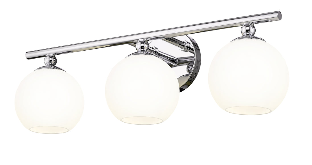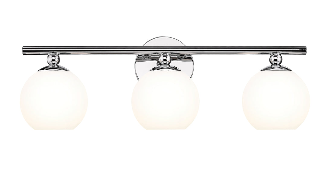 Bring a radiant look that highlights a custom vanity with this contemporary three-light vanity wall light, a classic mix of modern and retro elements that add festive attitude. From the Neoma collection comes a vanity light ideal for an updated ensuite or guest bath with a craving for attention. Opal etched glass globe shades and a minimalist-inspired gleaming chrome finish steel frame join to deliver a stylish look with charming personality.