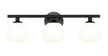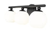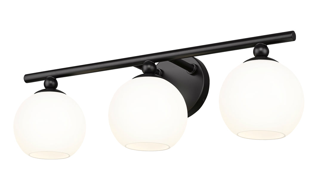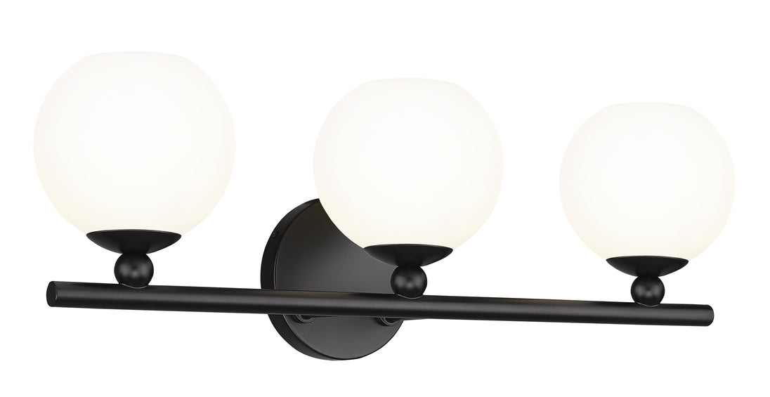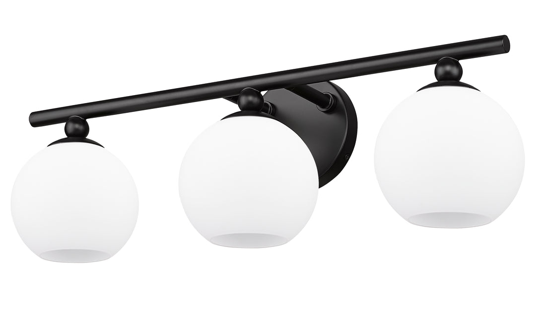 Custom bath vanities welcome the bold style and festive design of this contemporary three-light vanity wall light, a classic mix of modern and retro elements that deliver attitude. From the Neoma collection comes a vanity light ideal for an updated ensuite or guest bath with a craving for attention. Opal etched glass globe shades and a minimalist-inspired matte black finish steel frame join to deliver a stylish look with charming personality.