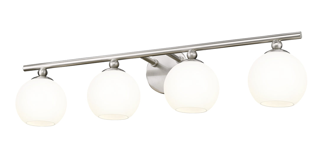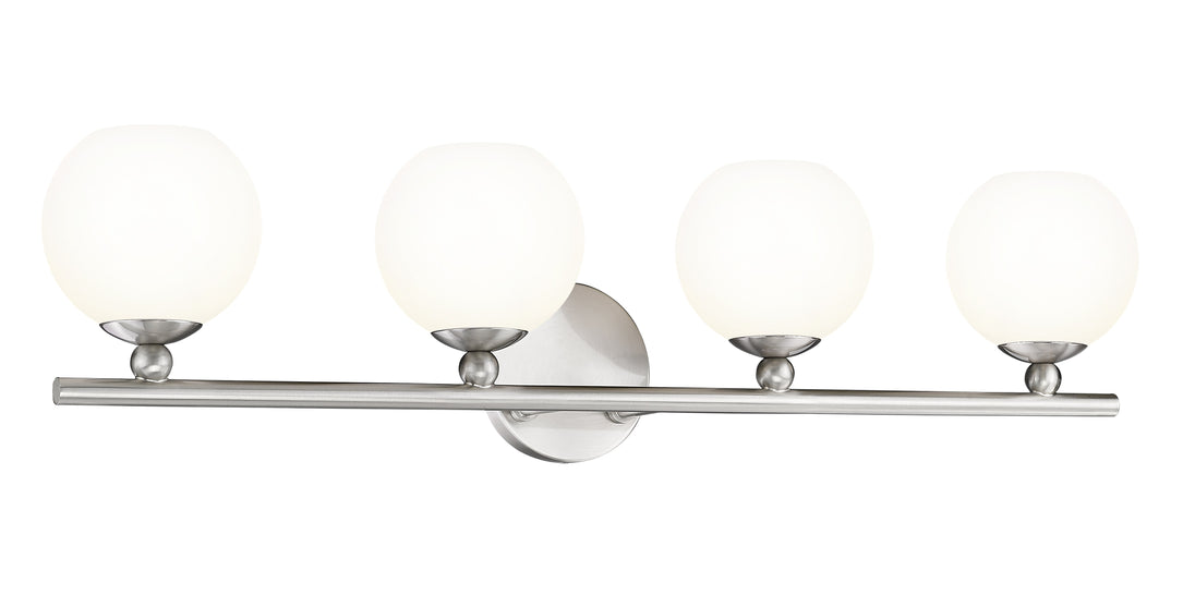 From the Neoma collection comes a tastefully elegant yet festive and fun fixture perfect for modern ensuite or guest bath spaces. This four-light vanity wall light shows off iconic globe shades made of opal etched glass, all affixed to a minimalist-inspired frame and mount crafted of brushed nickel finish steel. The expressive personality of a wall light with a hint of retro influence delivers personality along with ambient lighting for a contemporary bathroom.