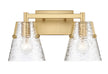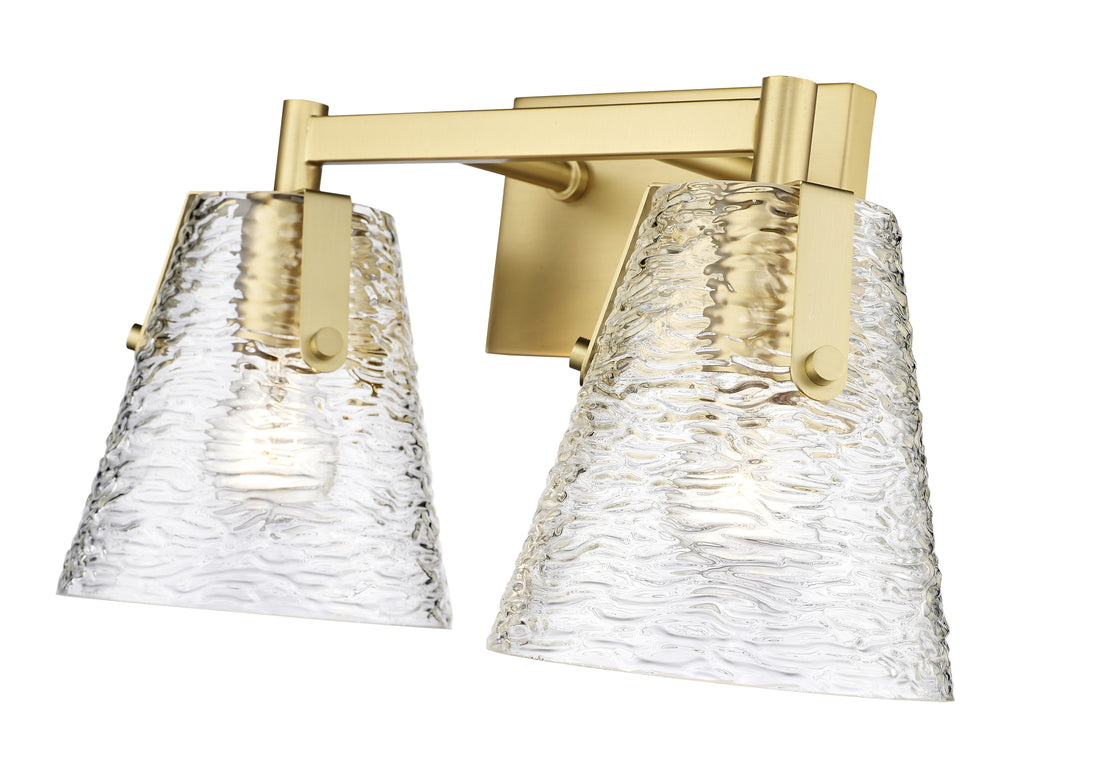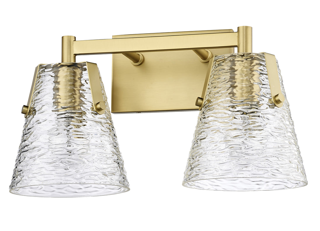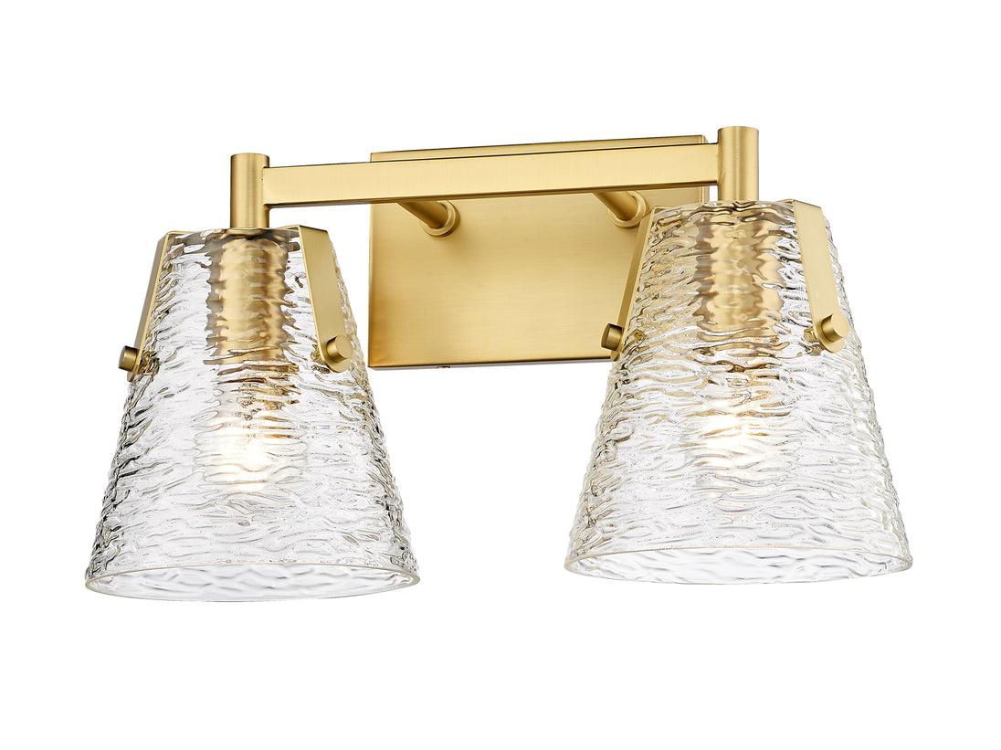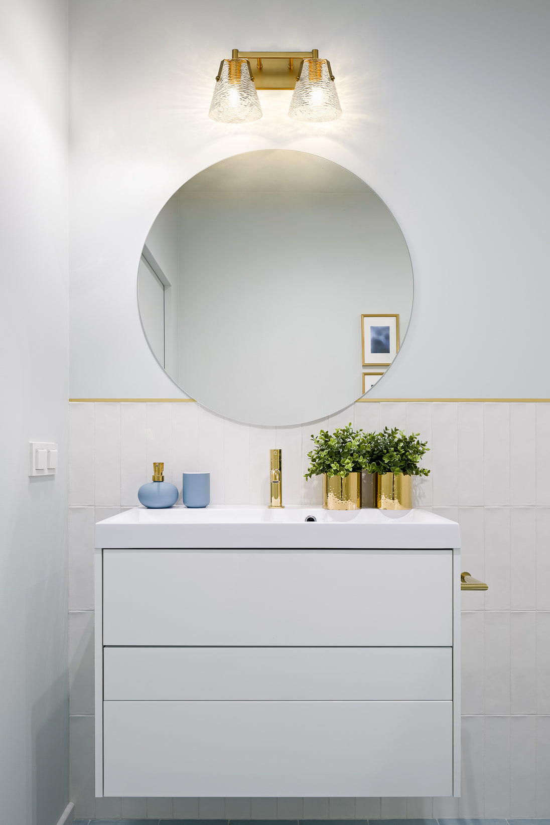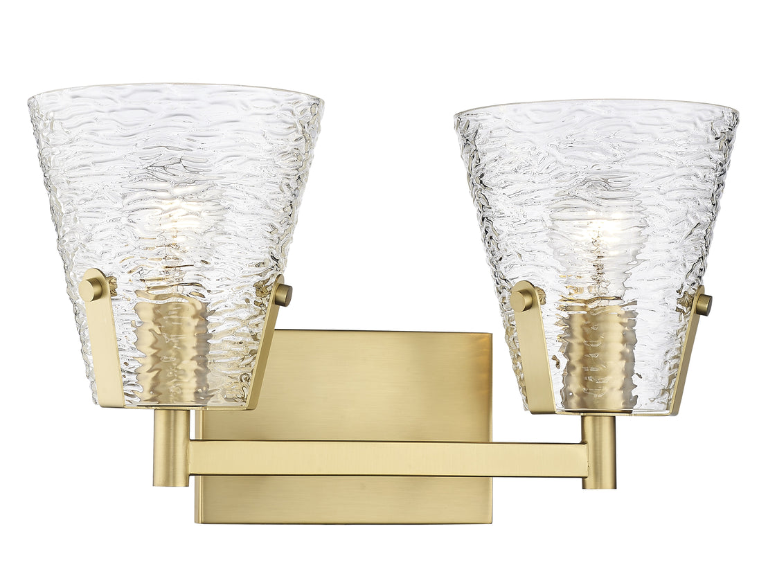 Ensuites and guest bath spaces shine with a chic vanity bath light showcasing clear textured glass conical shades. From the Analia collection, this two-light vanity light is a great choice for contemporary or transitional bathrooms and hallways. Minimalism delivers order to a modern gold finish steel frame offering versatility and sophistication.