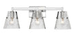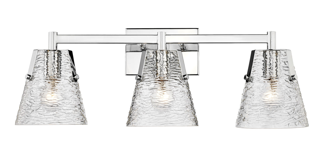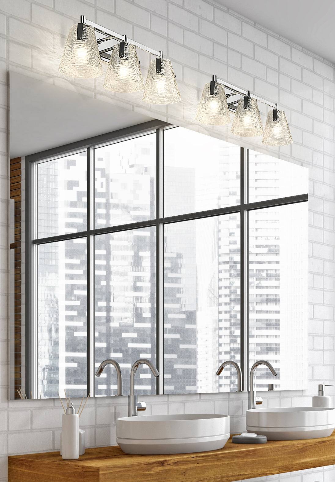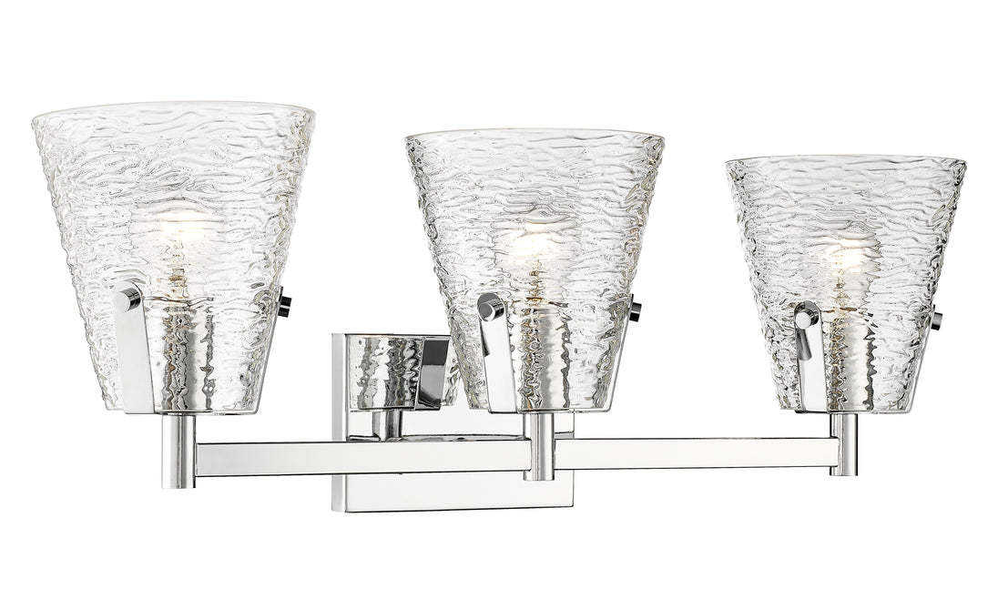 A gleaming chrome finish steel frame shapes this chic three-light vanity bath light, a superb choice for adding elegance and ambient lighting. Crowning a custom vanity, this fixture from the Analia collection brings a bit of nautical charm with a trio of conical shades fashioned of clear textured glass. Choose this three-light vanity light to dress up a contemporary or transitional ensuite or guest bath.