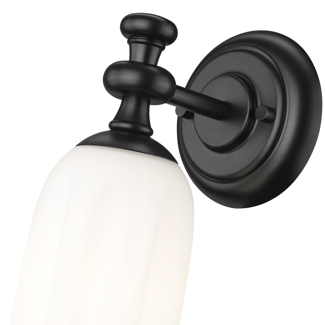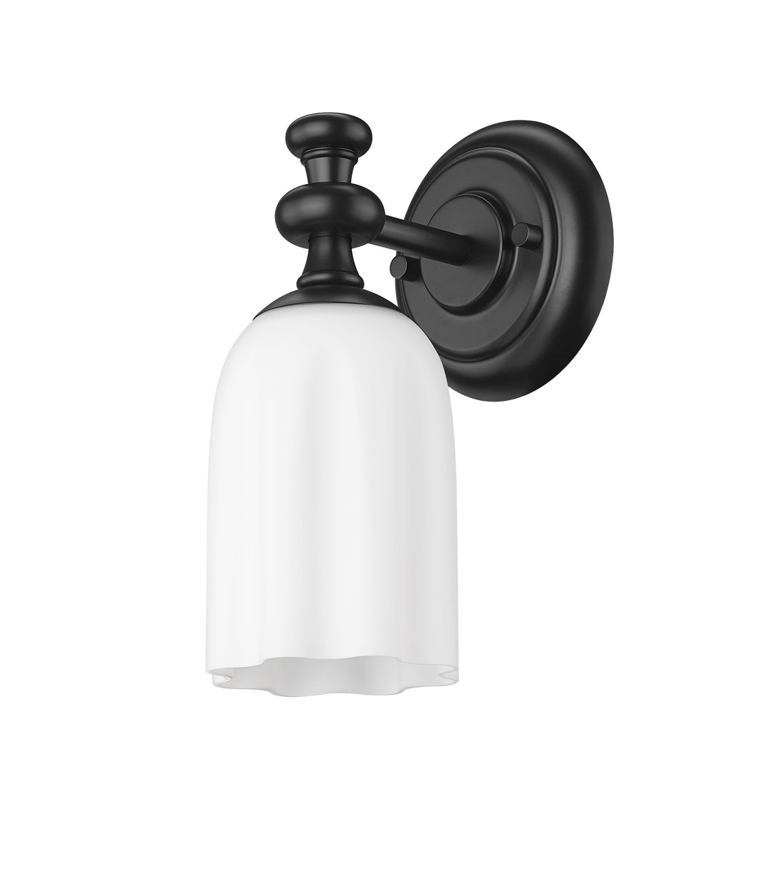 A decorative flourish and scalloped detail highlight this modern one-light wall sconce from the Orion collection. In matte black, it's a strong statement piece in any setting, offering soft illumination with etched opal glass that creates a refined sense of delicacy.