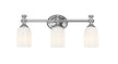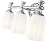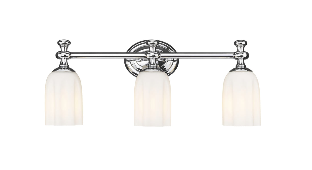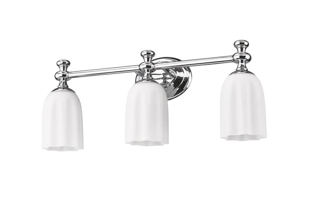 Gleaming chrome adds a touch of shine to the opal etched glass featured on a modern three-light vanity fixture. It infused a sense of delicacy and romance with decorative flourishes over the shades and delicate scalloped glass. Three lights create bright ambient illumination, ideal for daily grooming and beauty tasks.