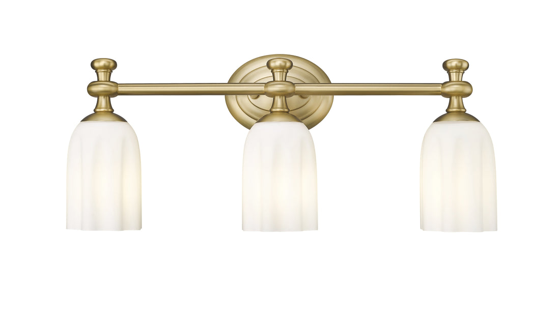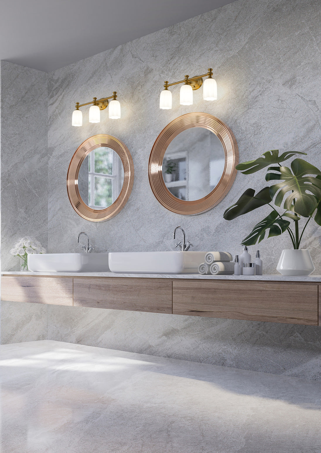 Infused with warmth, a modern gold finish instantly elevates the look and feel of a modern three-light vanity fixture. Its oval wall plate and decorative arms and flourishes create a refined ambiance, while opal etched glass ensures diffused illumination for all your daily tasks and beauty rituals.