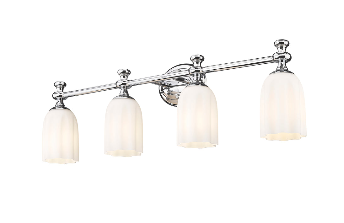 Span a generous countertop with the bright, diffused illumination of a modern four-light vanity fixture. The sconce pairs an oval wall plate with decorative flourishes to create a touch of romantic charm, perfect for an inviting but refined bath. A gleaming chrome finish highlights steel construction while opal etched glass is delicately scalloped to create a sense of movement and character.