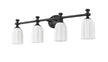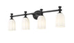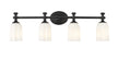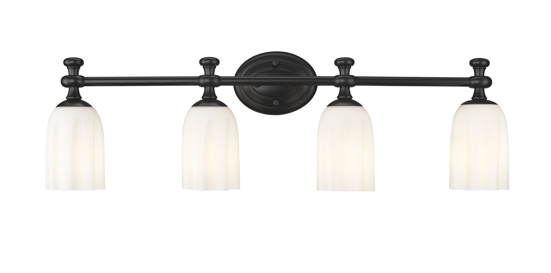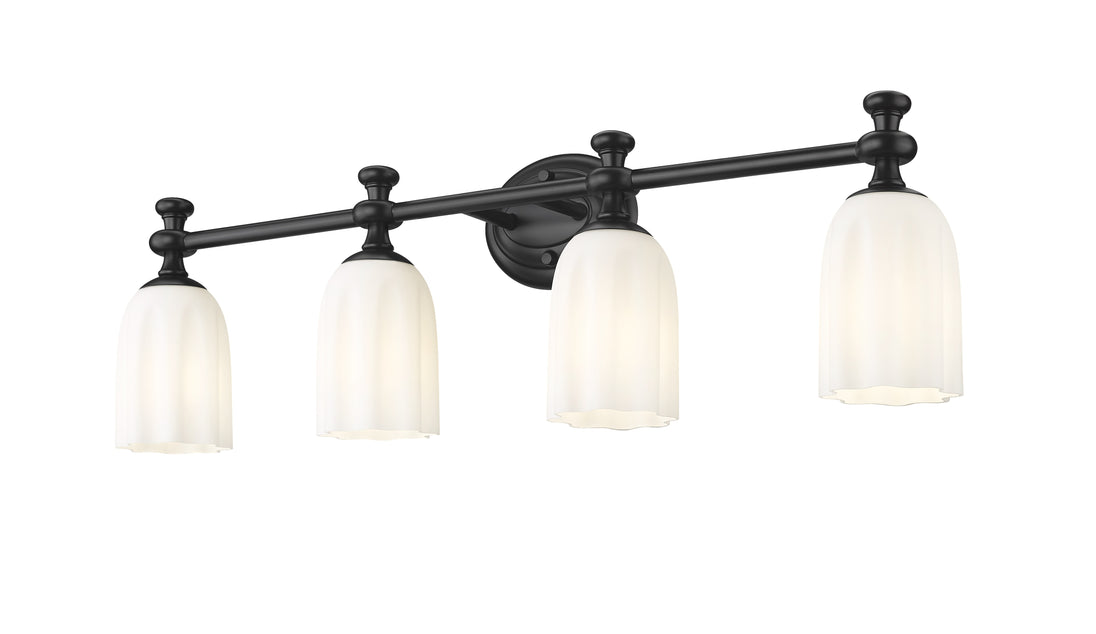 Matte black creates a sense of drama for a modern four-light vanity fixture. Ideal for your contemporary bath, it's a strong, refined look that pairs an oval wall plate with decorative flourishes over opal etched glass. Delicate scalloping adds decorative appeal to its four shades, which ensure soft, bright illumination for your space.