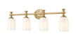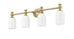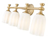 Appreciate the delicate design and warm modern gold finish featured on this modern four-light vanity fixture. Designed to elevate surrounding decor, it boasts a decorative oval wall plate and flourishes over its shades, creating a refined look and feel over any vanity. Opal etched glass is delicately scalloped to create a touch of movement and energy, ideal for a sophisticated bathroom space.