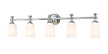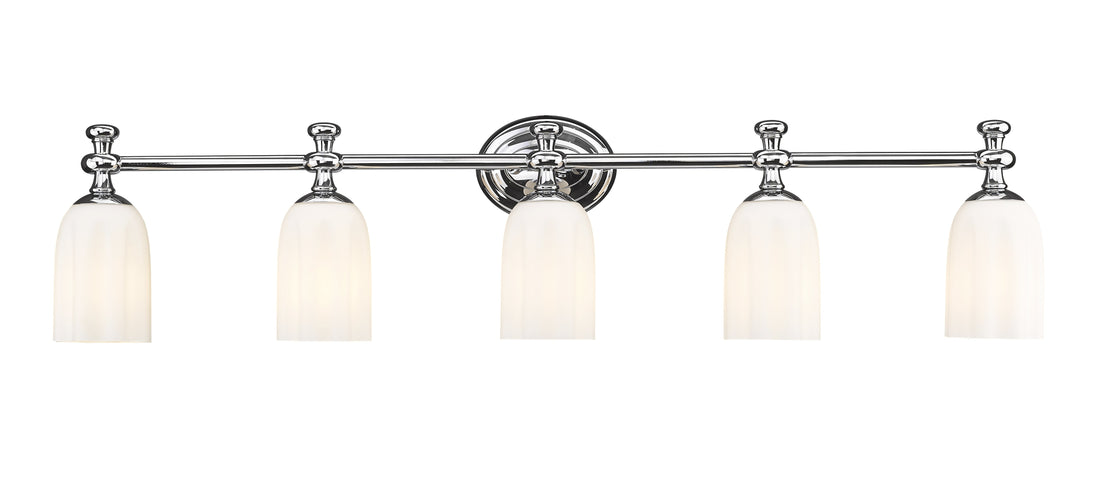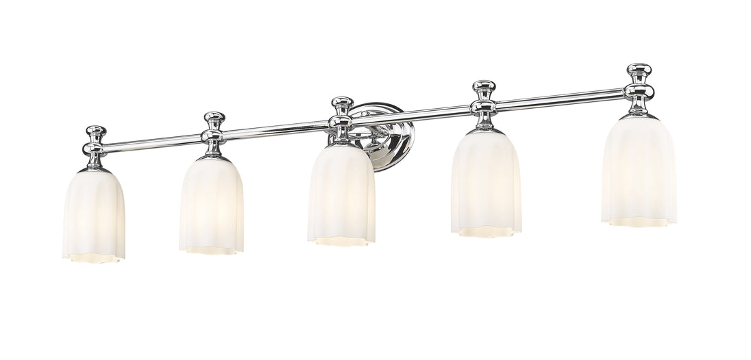 A chic chrome finish adds gleaming allure to a modern five-light vanity fixture. Its chic design is anchored with an oval wall plate and paired with a straight arm and decorative flourishes. Scalloped shades feature opal etched glass, delivering a touch of romantic texture and depth over your vanity.