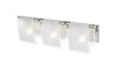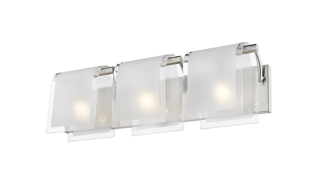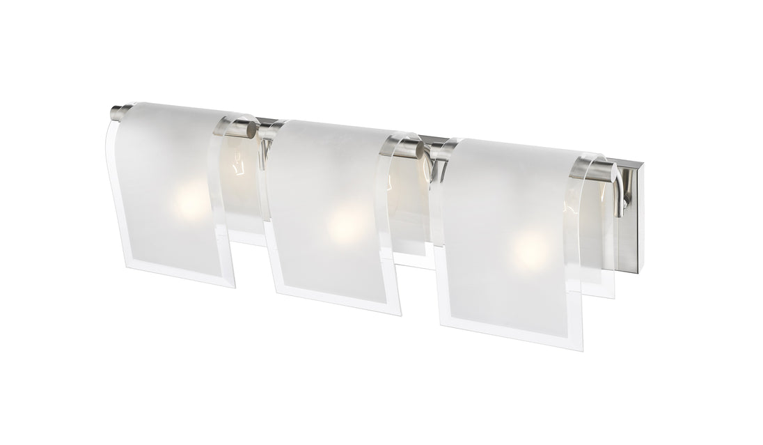 Bent frosted glass shades are hung over brushed nickel hardware on this 3 light vanity to create a modern touch for any room.