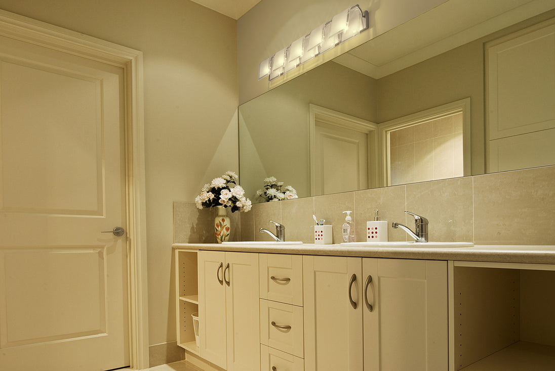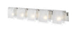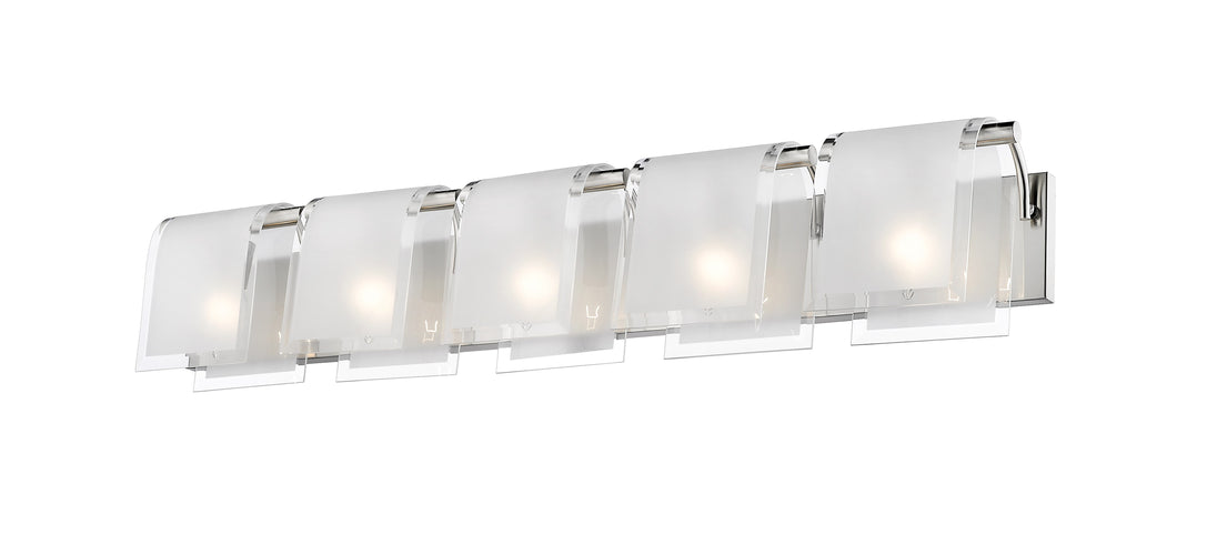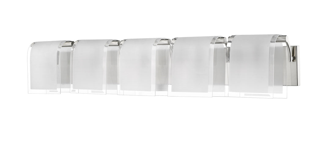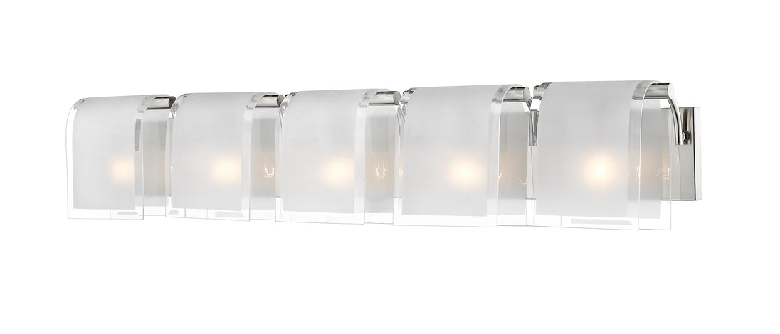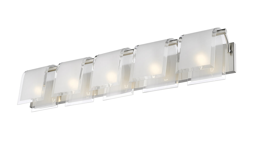 Bent frosted glass shades are hung over brushed nickel hardware on this 5 light vanity to create a modern touch for any room.