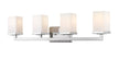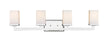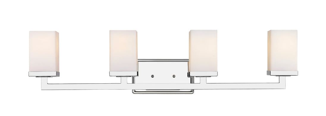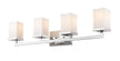 This four light vanity fixture provides a clean modern look with its use of rectangular matte opal shades and chrome geometric inspired hardware. This fixture can either be hung up or down, depending on the needs of the user.