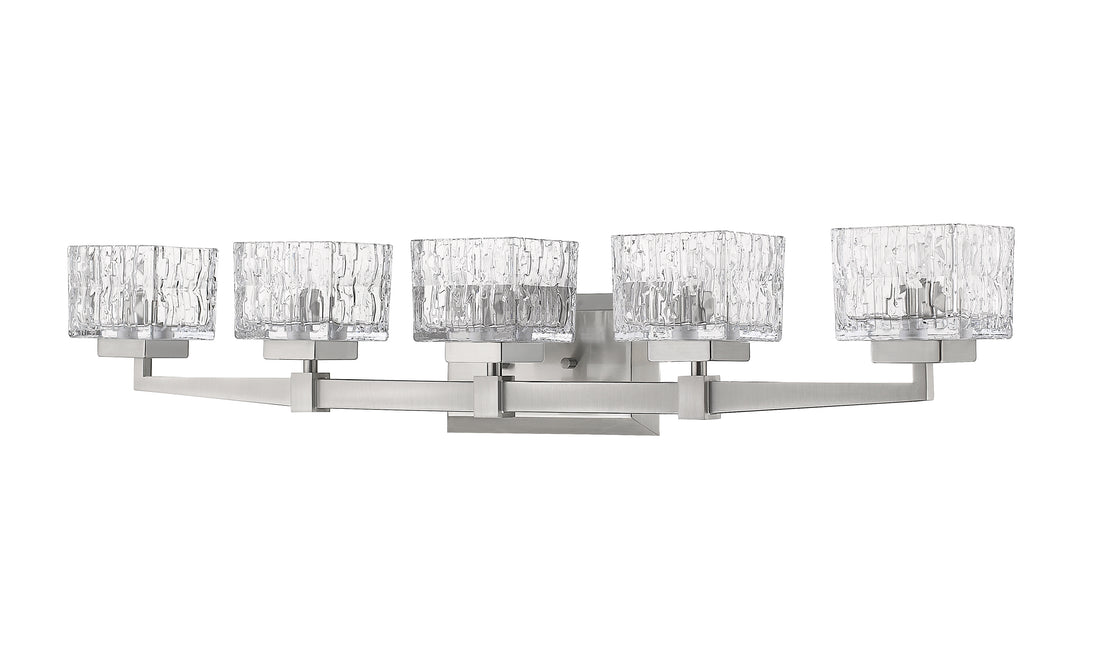With sleek brushed nickel finish steel construction and clear crystal cut glass shades, this five-light vanity is a natural choice for a casually contemporary bath space. Enjoy an Art Deco influence in its intriguing design and choose surrounding fixtures and accents that make it stand out.