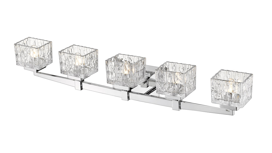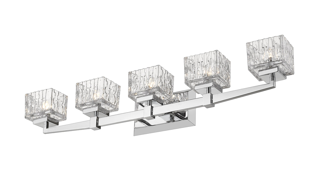 This chrome finish five-light vanity light energizes a contemporary bath space. Take advantage of a tasteful Art Deco inspired silhouette and the beautiful pairing of chrome steel and clear glass.