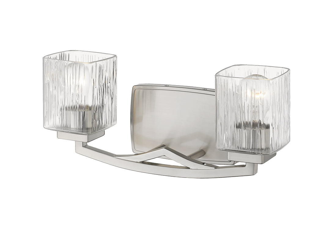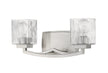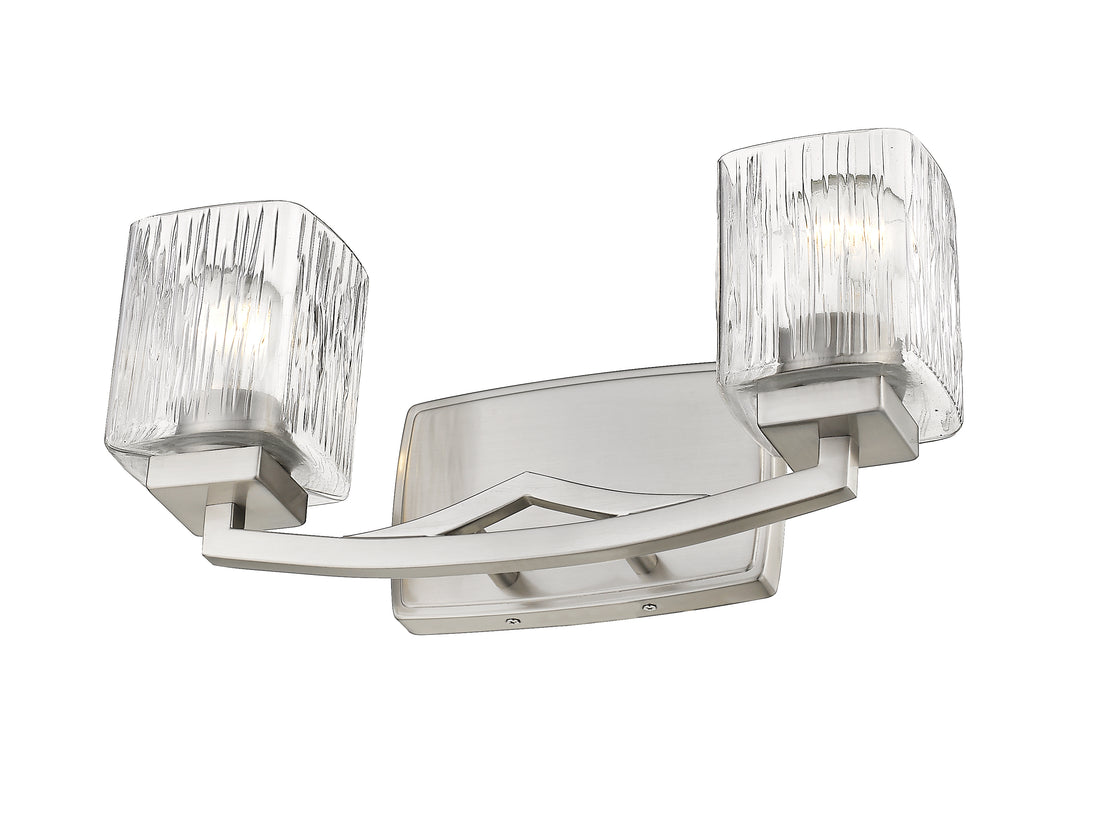 Metropolitan flavor makes its way into the design of this brushed nickel two-light vanity light. Add character to a contemporary space with a stylish steel frame that hosts a pair of chiseled clear glass shades.