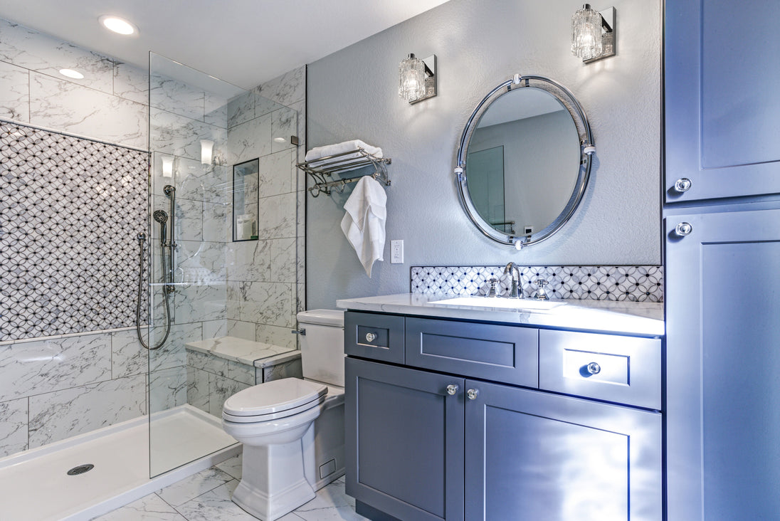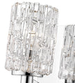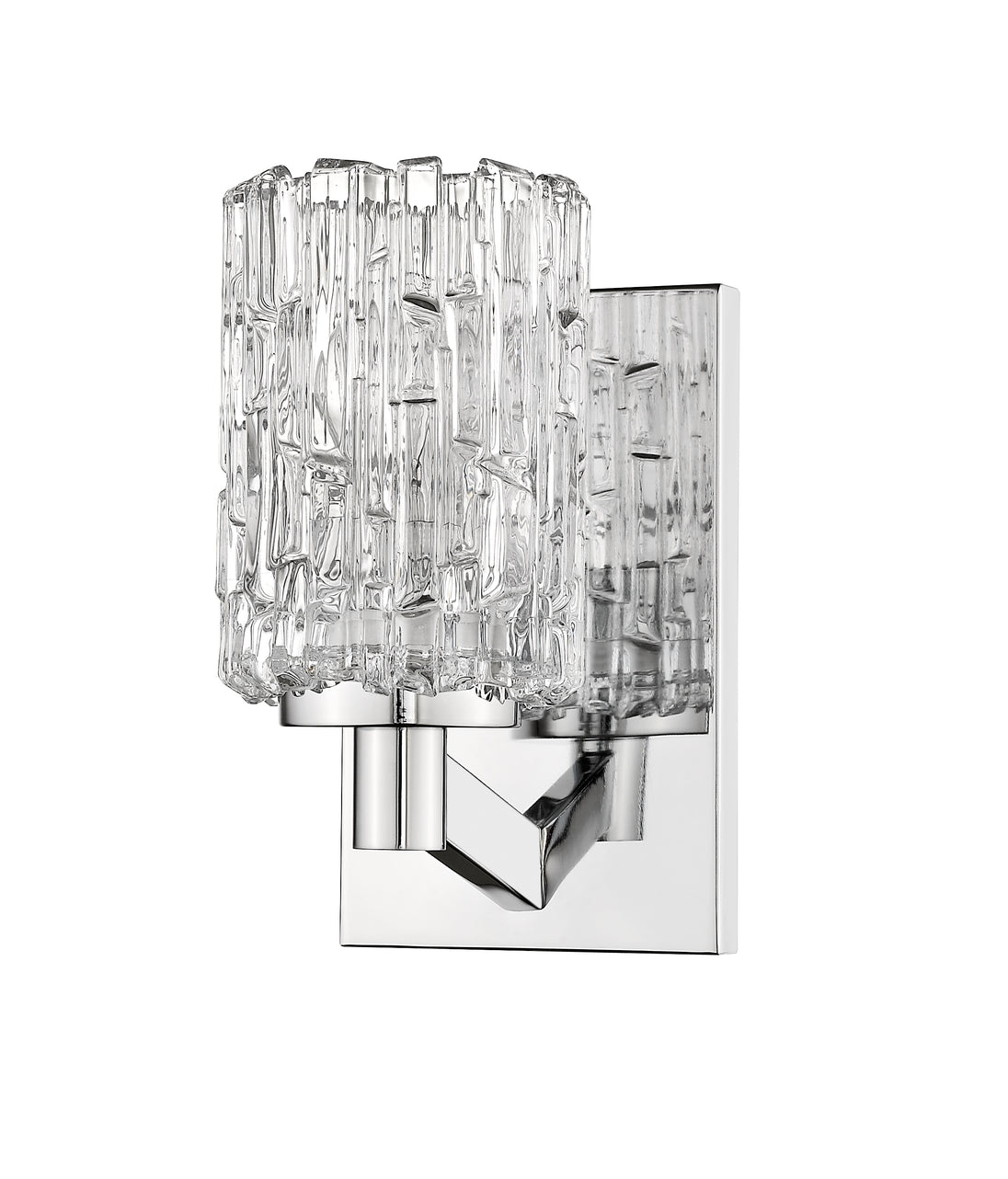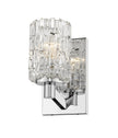 A contemporary haven is bejeweled with glam as this exquisite single-light wall sconce becomes a focal point in a custom bathroom. A crystal-like glass shade adds an air of exclusivity to a fixture with a sleek Chrome finish metal mount and arm, and an air of high-class, upscale elegance.