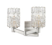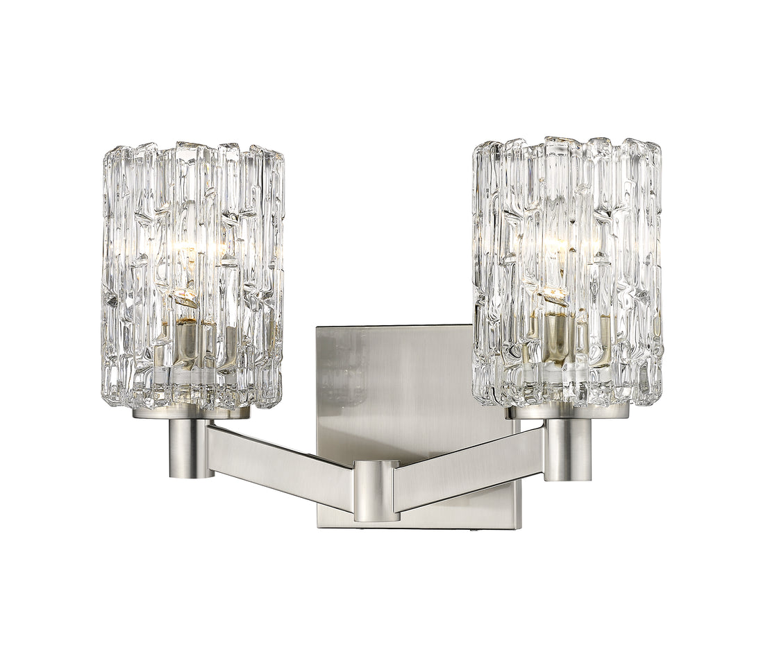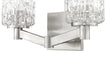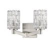 A contemporary haven is bejeweled with glam as this exquisite two-light vanity light becomes a focal point in a custom bath space. Crystal-like glass shades add an air of exclusivity to a fixture with a beautiful Brushed Nickel finish metal mount and arms, and an air of high-class, upscale elegance.