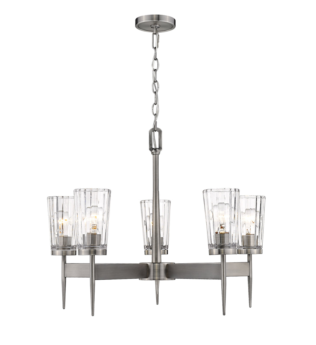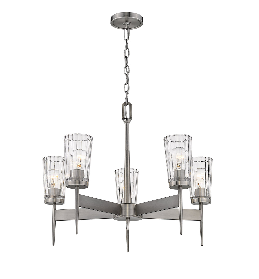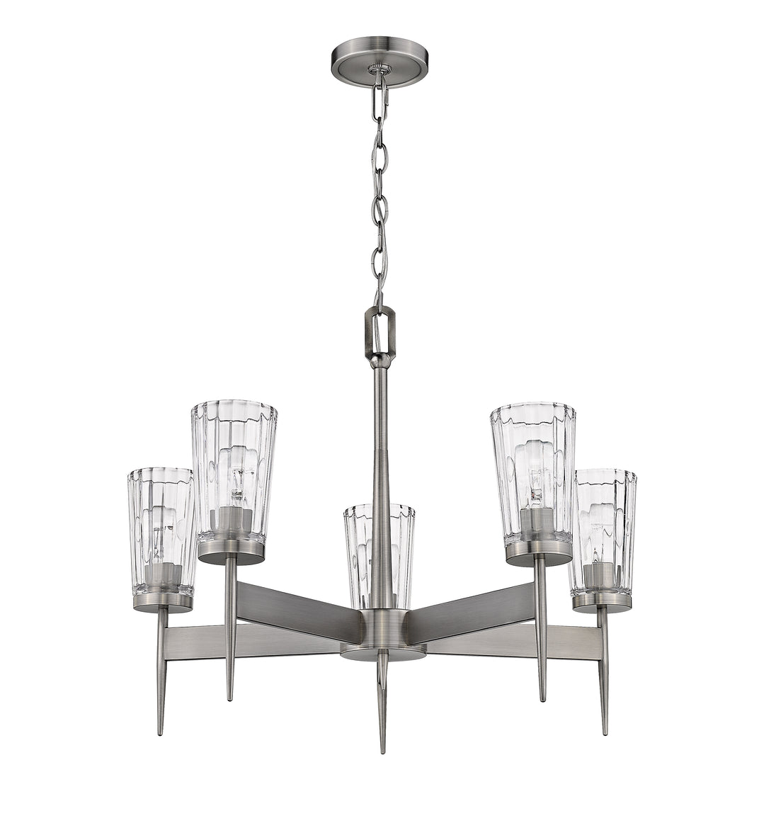 An intriguing silhouette with impressive materials allows this five-light chandelier to become part of an overall sophisticated design scheme. Gorgeous flared glass shades and sleek polished Antique Nickel finish extension stems in a geometric arrangement offer an upscale attitude and an efficient way to illuminate dining and living areas.