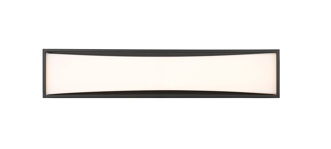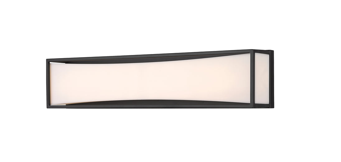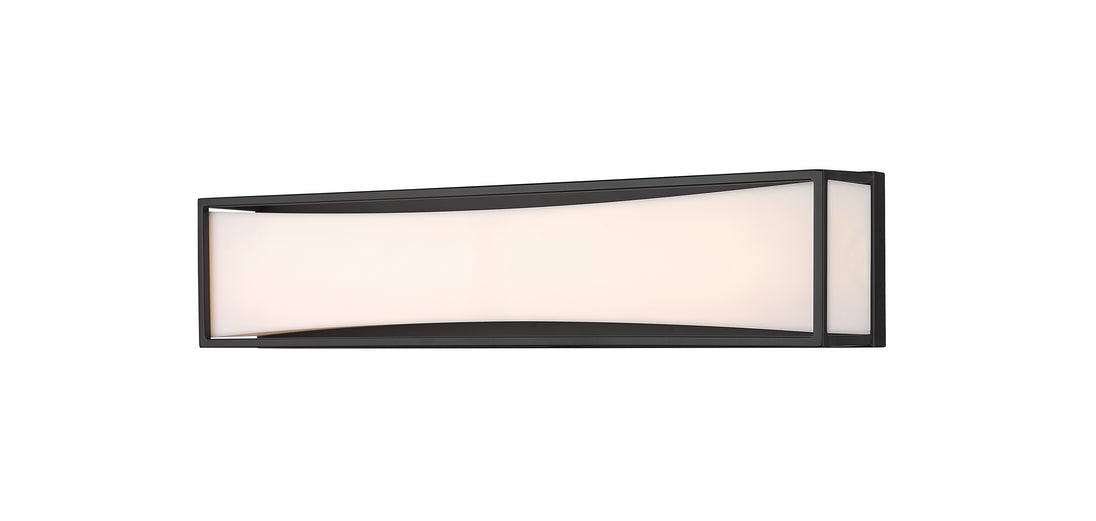 Sleek, slim lines of matte black finish metal give this two-light vanity light a clean, modern look. Perfect for a powder room, it boasts a delicate, frosted white shade that diffuses the light into a soft, graceful glow.
